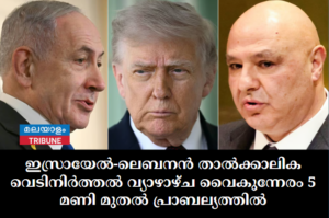 വാഷിംഗ്ടൺ/ജെറുസലേം: ഇസ്രായേലും ലെബനനും തമ്മിൽ 10 ദിവസത്തെ വെടിനിർത്തലിന് ധാരണയായതായി അമേരിക്കൻ പ്രസിഡന്റ് ഡൊണാൾഡ് ട്രംപ് അറിയിച്ചു. ഇതോടൊപ്പം ഇറാനുമായുള്ള തർക്കങ്ങൾ പരിഹരിക്കുന്നതിനായുള്ള നിർണ്ണായക ചർച്ചകൾ ഉടൻ ഉണ്ടാകുമെന്നും അദ്ദേഹം സൂചിപ്പിച്ചു. വ്യാഴാഴ്ച വൈകുന്നേരം 5 മണി മുതൽ പ്രാബല്യത്തിൽ വന്ന…