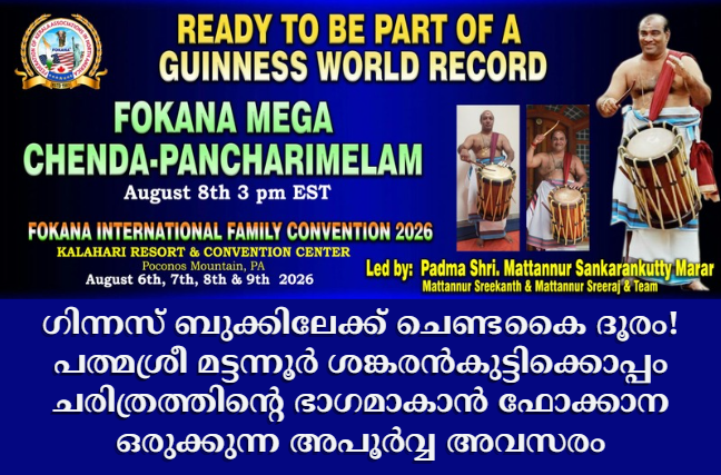 ന്യൂജേഴ്സി: ചെണ്ടയുടെ ഓരോ കൊട്ടും വെറുമൊരു താളമല്ല, അത് പ്രവാസിയുടെ അതിജീവനത്തിന്റെയും മണ്ണിലെ വേരുകളുടെയും ഉശിരുള്ള മുഴക്കമാണ്. ഫൊക്കാന (FOKANA) ഇന്റർനാഷണൽ ഫാമിലി കൺവെൻഷൻ 2026-ന്റെ ഭാഗമായി ഓഗസ്റ്റ് 8-ന് പെൻസിൽവേനിയയിലെ കലഹാരി റിസോർട്ടിൽ അരങ്ങേറുന്ന “പഞ്ചാരി മേളം ” വെറുമൊരു ഗിന്നസ് വേൾഡ് റെക്കോർഡ് ശ്രമമല്ല; മറിച്ച് ലോകമെമ്പാടുമുള്ള മലയാളികളെ ഒരേ താളത്തിൽ കോർത്തിണക്കുന്ന ഒരു മഹാസംഗമമാണ്.