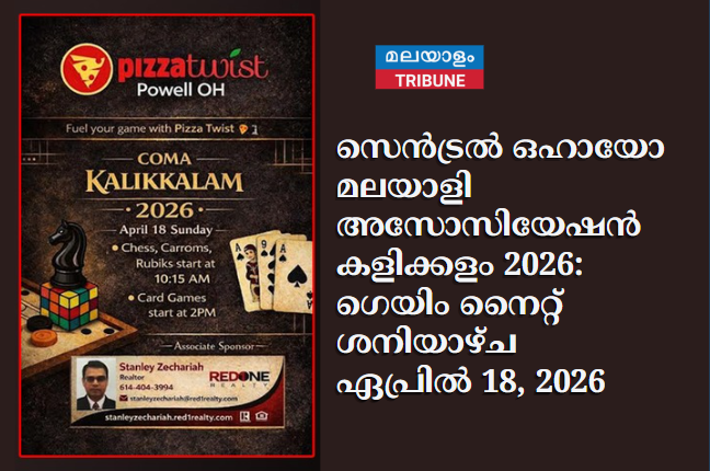 കൊളംബസ്, ഒഹായോ: കൊളംബസ് പ്രദേശത്തെ മലയാളി സമൂഹത്തെ ഒരുമിപ്പിക്കുന്ന പരിപാടിയായ കോമ (COMA) കളിക്കളം 2026 ഗെയിം നൈറ്റ് ഏപ്രിൽ 18 ശനിയാഴ്ച നടക്കും. നൂറിലതികം പേർ പങ്കെടുക്കുമെന്ന് പ്രതീക്ഷിക്കുന്ന ഈ പരിപാടി കുടുംബങ്ങൾക്കും കുട്ടികൾക്കും ഒരുപോലെ ആവേശകരമായ ഒരു സംഗമമാകുമെന്ന് സംഘാടകർ അറിയിച്ചു.