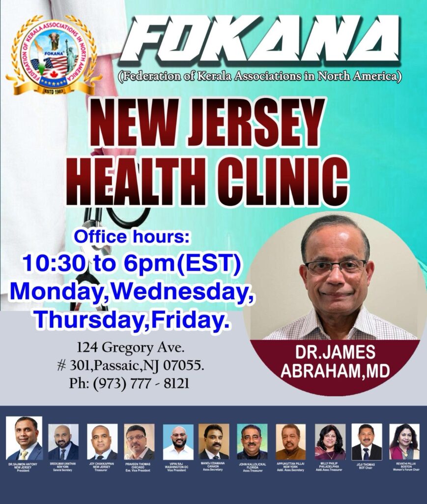 നാട്ടിൽ നിന്നും വരുന്ന ഇൻഷുറൻസ് പരിരക്ഷയില്ലാത്ത ആളുകൾക്കും അതുപോലെ അമേരിക്കയിലുള്ള ഇൻഷുറൻസ് പരിരക്ഷയില്ലാത്ത മലയാളികൾക്ക് ബേസിക് ചികിത്സ നൽകുക എന്ന ലക്ഷ്യത്തോട് ആണ് ഫൊക്കാന ഹെൽത്ത് ക്ലിനിക്ക് നിലവിൽ വന്നിരിക്കുന്നത് . ഈ ഹെൽത്ത് ക്ലിനിക്കുകളുടെ ന്യൂ ജേഴ്സി ഓഫീസ് ആയി പ്രവർത്തിക്കുന്നത് (124 Gregory Ave # 301 ,Passaic ,New Jersey ) ഡോ. ജെയിംസ് എബ്രഹാം MD യുടെ സ്വന്തം ഓഫീസിൽ തന്നെയാണ്.