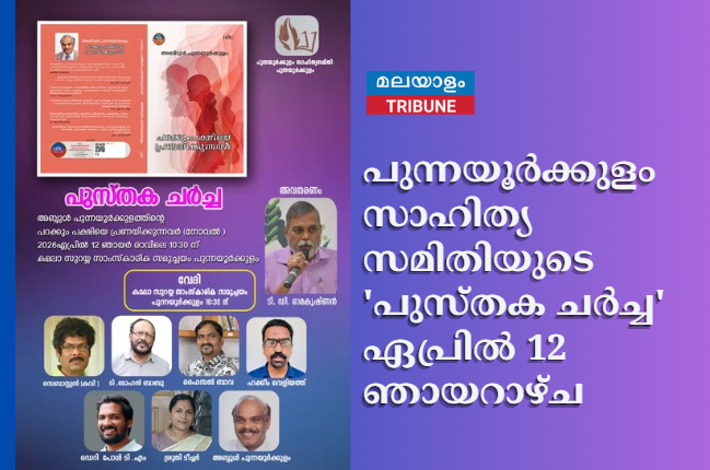 2026 ഏപ്രില് 12 ഞായറാഴ്ച രാവിലെ 10:30ന് പുന്നയൂര്ക്കുളത്തെ കമലാ സുരയ്യ സാംസ്ക്കാരിക സമുച്ചയത്തില് പ്രശസ്ത കഥാകാരന് ടി.ഡി. രാമകൃഷ്ണന് നയിക്കുന്ന ചര്ച്ചയില് പ്രമുഖര് സംബന്ധിക്കും.
