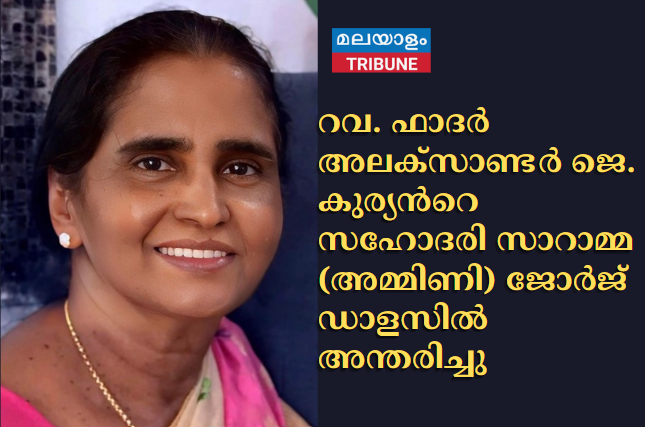 ഡാളസ് :പള്ളിപ്പാട് കടയ്ക്കൽ പരേതരായ കോശിയുടെയും പെണ്ണമ്മ കുര്യന്റെയും മൂത്തപുത്രി സാറാമ്മ (അമ്മിണി) ജോർജ് അന്തരിച്ചു. 2026 ഏപ്രിൽ 24 വെള്ളിയാഴ്ച ഉച്ചതിരിഞ്ഞ് 2:35-ന് ടെക്സാസിലെ ഡാളസ് ഫോർട്ട് വർത്തിൽ വെച്ചായിരുന്നു അന്ത്യം. വാർദ്ധക്യസഹജമായ അസുഖങ്ങളെത്തുടർന്ന് കുടുംബാംഗങ്ങളുടെ സാന്നിധ്യത്തിൽ സമാധാനപരമായാണ് അവർ നിത്യതയിലേക്ക് യാത്രയായത്.