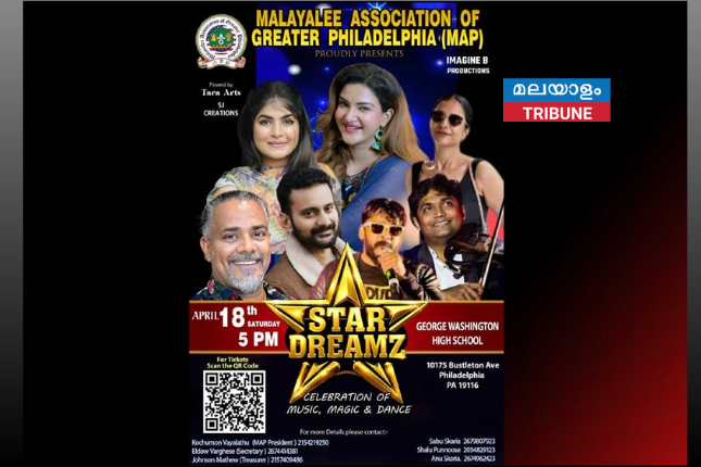 ഫിലാഡൽഫിയ: മലയാളി സമൂഹത്തിന്റെ സാംസ്കാരിക പൈതൃകം ഉയർത്തിപ്പിടിക്കുന്നതിൽ പ്രമുഖ സ്ഥാനത്ത് നിൽക്കുന്ന മലയാളി അസോസിയേഷൻ ഓഫ് ഗ്രേറ്റർ ഫിലാഡൽഫിയയുടെ ആഭിമുഖ്യത്തിൽ നടത്തുന്ന സ്റ്റാർ ഡ്രീംസ് സ്റ്റേജ് ഷോ 2026 ന്റെ ഒരുക്കങ്ങൾ പൂർത്തിയായി വരുന്നു .ഏപ്രിൽ 18 ശനിയാഴ്ച് അഞ്ചുമണിക്ക് ജോർജ് വാഷിംഗ്ടൺ ഹൈസ്കൂൾ ഓഡിറ്റോറിയത്തിൽ ഹണി റോസും കൂട്ടരും അവതരിപ്പിക്കുന്ന വിസ്മയകരമായ ഈ കലാവിരുന്നിൽ പങ്കുചേരാൻ ഹൃദയം നിറഞ്ഞ ക്ഷണം അറിയിക്കുന്നു.