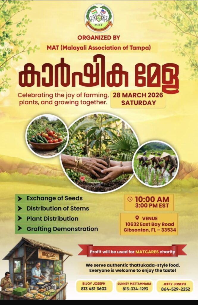 മലയാളി അസോസിയേഷൻ ഓഫ് ടാമ്പായുടെ “കാർഷിക മേള” മാർച്ച് 28ന് ശനിയാഴ്ച്ച