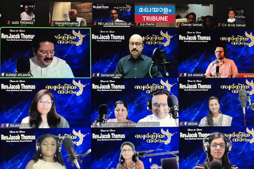 അറ്റ്ലാന്റ: പ്രശസ്ത ഗായകനും വരികളെഴുത്തുകാരനുമായ അറ്റ്ലാന്റ മാർത്തോമാ ചർച്ച് വികാരി റവ. ജേക്കബ് തോമസ് (ആനിക്കാട് അച്ചൻ) നയിച്ച ‘ഫേസ് ടു ഫേസ്’ ലൈവ് സ്ട്രീമിംഗ് സംഗീത നിശ ഭക്തിസാന്ദ്രമായി സമാപിച്ചു.സ്വർഗീയ നാദം കൂട്ടായ്മ ജനുവരി 25 ഞായറാഴ്ച വൈകിട്ട് നടന്ന പരിപാടിയിൽ ലോകത്തിന്റെ വിവിധ ഭാഗങ്ങളിൽ നിന്നുള്ള സംഗീതപ്രേമികൾ സൂം (Zoom) പ്ലാറ്റ്ഫോമിലൂടെ പങ്കെടുത്തു.