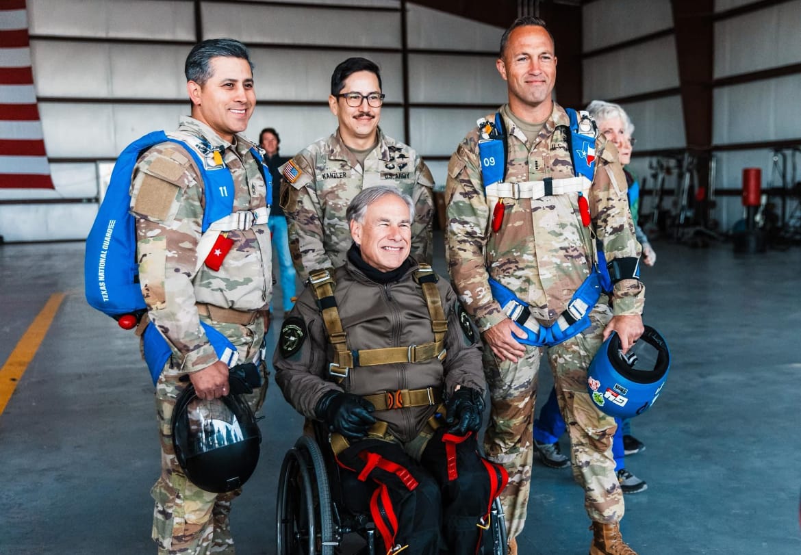 "തിങ്കളാഴ്ച ആദ്യമായി ഗവർണർ സ്കൈഡൈവ് ചെയ്തു".മുൻ സംസ്ഥാന പ്രതിനിധി ജോൺ സിറിയർ, ആർ-ലോക്ഹാർട്ട് ട്വീറ്റ് ചെയ്ത വീഡിയോ പ്രകാരം ഡൈവ് വിജയകരമായിരുന്നു. അബോട്ടും ബ്ലാഷ്കെയും മറ്റൊരു വ്യക്തിയുമായി ഘടിപ്പിച്ചിരിക്കുന്ന പ്രത്യേക ടാൻഡം പാരച്യൂട്ടുകളിൽ ഇറങ്ങുന്നത് വീഡിയോയിൽ കാണിച്ചു.