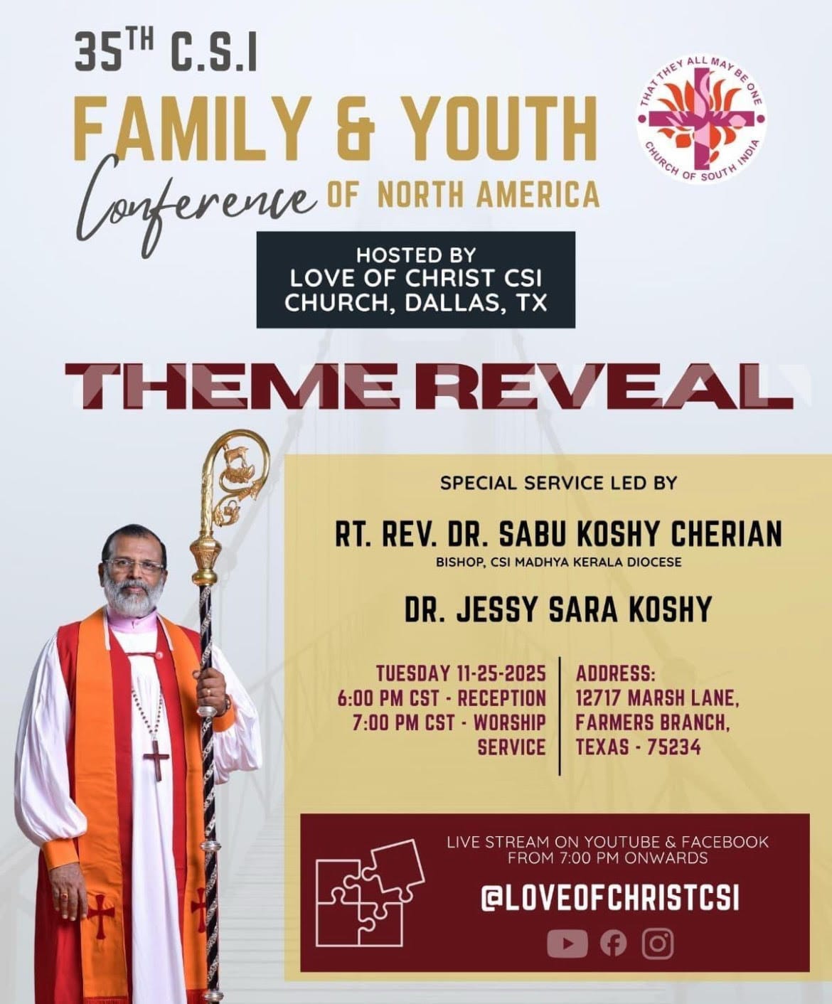 ഡാളസ്: വടക്കേ അമേരിക്കയിലെ 35-ാമത് സി.എസ്.ഐ കുടുംബ-യുവജന സമ്മേളന തീം പ്രകാശനം നവംബർ 25 നു ഡാളസ്സിൽ നടക്കും,