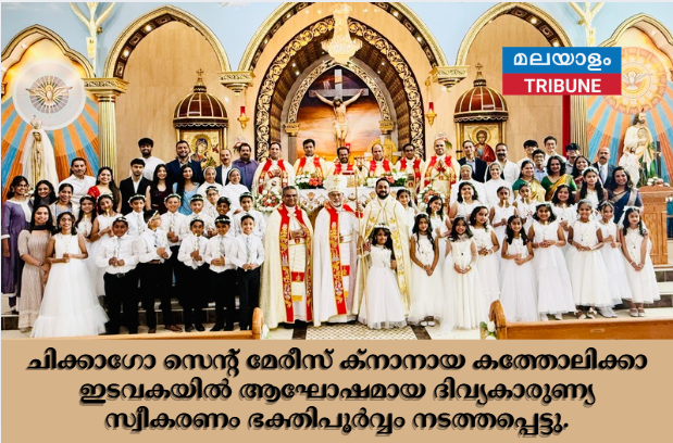 ചിക്കാഗോ: ചിക്കാഗോയിലെ സെന്റ് മേരീസ് ക്നാനായ കത്തോലിക്കാ ഇടവകയിലെ പൊതുവായ ആഘോഷപൂർവമായ ദിവ്യകാരുണ്യ സ്വീകരണം മെയ് 25 ഞായറാഴ്ച ഉച്ചകഴിഞ്ഞ് 3 മണിക്ക് ആരംഭിച്ച തിരുക്കർമ്മങ്ങളോടെ ഭക്ത്യാദരപൂർവ്വം നടത്തപ്പെട്ടു. കോട്ടയം അതിരൂപതാധ്യക്ഷൻ ആർച്ച് ബിഷപ്പ് മാർ മാത്യു മൂലക്കാട്ട് മുഖ്യ കാർമികത്വം വഹിച്ച തിരുക്കർമ്മങ്ങളിൽ ക്നാനായ റീജിയൻ ഡയറക്ടർ മോൺസിഞ്ഞോർ തോമസ് മുളവനാൽ, വികാരി ഫാ. സിജു മുടക്കോടിൽ, അസി. വികാരി ഫാ. അനീഷ് മാവേലിപുത്തെൻപുര, കൈപ്പുഴ ഫൊറോനാ വികാരി ഫാ. സാബു മാലിത്തുരുത്തേൽ, ഫാ. ബോബൻ വട്ടംപുറത്ത്, ഫാ. ബേബി വെള്ളാപ്പള്ളിൽ, ഫാ. ജോസ് ആദോപള്ളിൽ ഫാ. ബിൻസ് ചേത്തലിൽ എന്നിവർ സഹകാർമികത്വം വഹിച്ചു. മുപ്പത് കുട്ടികളാണ് ഒരു വർഷത്തോളം നീണ്ടു നിന്ന ഒരുക്കങ്ങൾക്ക് ശേഷം ഈ വർഷത്തെ ആഘോഷപൂർവ്വമായ ദിവ്യകാരുണ്യ സ്വീകരണത്തിൽ പങ്കെടുത്തത്. സജി പൂതൃക്കയിൽ, മനീഷ് കൈമൂലയിൽ എന്നിവരുടെ നേതൃത്വത്തിൽ നടത്തപെടുന്ന വിശ്വാസ പരിശീലന സ്കൂളിലെ അധ്യാപകരുടെ കഠിന പ്രയത്നത്തിന്റെയും സമർപ്പണത്തിന്റെയും ഫലമായാണ് ഒരു വർഷത്തോളം നീണ്ടു നിന്ന പരിശീലനത്തിനൊടുവിൽ ദിവ്യകാരുണ്യ സ്വീകരണം ആഘോഷപൂർവ്വം നടത്തുവാൻ സാധിച്ചത്. പള്ളിയിലെ തിരുക്കർമ്മങ്ങൾക്ക് ശേഷം വൈകിട്ട് ആറുമണിമുതൽ നൈൽസിലെ വൈറ്റ് ഈഗിൾ ബാങ്ക്വറ്റ് ഹാളിൽ വച്ച് മാതാപിതാക്കളുടെ നേതൃത്വത്തിൽ ആഘോഷങ്ങളും സംഘടിപ്പിച്ചിരുന്നു. വിഭവ സമൃദ്ധമായ ഭക്ഷണവും കലാ പരിപാടികളും ആഘോഷത്തിന് വർണ്ണപ്രഭ ചാർത്തി. ഇടവക വികാരി ഫാ. സിജു മുടക്കോടിൽ, അസി. വികാരി ഫാ. അനീഷ് മാവേലിപുത്തെൻപുര, സെക്രട്ടറി സിസ്റ്റർ ഷാലോം, കൈക്കാരന്മാരായ സാബു കട്ടപ്പുറം, ബിനു പൂത്തുറയിൽ, ലൂക്കോസ് പൂഴിക്കുന്നേൽ, ജോർജ്ജ് മറ്റത്തിപ്പറമ്പിൽ, നിബിൻ വെട്ടിക്കാട്ട്, പാരിഷ് കൗൺസിൽ സെക്രട്ടറി സണ്ണി മേലേടം, സജി പുതൃക്കയിലിന്റെ നേതൃത്വത്തിലുള്ള വിശ്വാസ പരിശീലന സ്കൂൾ അധ്യാപകർ, ജിനു പുന്നശ്ശേരിൽ, ടിനു പറഞ്ഞാട്ട് എന്നിവരുടെ നേതൃത്വത്തിലുള്ള മാതാപിതാക്കൾ എന്നിവർ ആഘോഷങ്ങൾക്ക് നേതൃത്വം നൽകി.