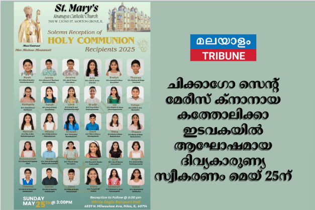 ചിക്കാഗോ: ചിക്കാഗോയിലെ സെന്റ് മേരീസ് ക്നാനായ കത്തോലിക്കാ ഇടവകയിലെ പൊതുവായ ആഘോഷപൂർവമായ ദിവ്യകാരുണ്യ സ്വീകരണം മെയ് 25 ഞായറാഴ്ച നടപ്പെടും. ഉച്ചകഴിഞ്ഞ് 3 മണിക്ക് ആരംഭിക്കുന്ന തിരുക്കർമ്മങ്ങൾക്ക് കോട്ടയം അതിരൂപതാധ്യക്ഷൻ ആർച്ച് ബിഷപ്പ് മാർ മാത്യു മൂലക്കാട്ട് മുഖ്യ കാർമികത്വം വഹിക്കും. ക്നാനായ റീജിയൻ ഡയറക്ടർ മോൺസിഞ്ഞോർ തോമസ് മുളവനാൽ, വികാരി ഫാ. സിജു മുടക്കോടിൽ, അസി. വികാരി ഫാ. അനീഷ് മാവേലിപുത്തെൻപുര എന്നിവർ തിരുക്കർമ്മങ്ങളിൽ സഹകാർമികത്വം വഹിക്കും. മുപ്പത് കുട്ടികളാണ് ഒരു വർഷത്തോളം നീണ്ടു നിന്ന ഒരുക്കങ്ങൾക്ക് ശേഷം ഈ വർഷത്തെ ആഘോഷപൂർവ്വമായ ദിവ്യകാരുണ്യ സ്വീകരണത്തിൽ പങ്കെടുക്കുന്നത്. സജി പൂതൃക്കയിൽ, മനീഷ് കൈമൂലയിൽ എന്നിവരുടെ നേതൃത്വത്തിൽ നടത്തപെടുന്ന വിശ്വാസ പരിശീലന സ്കൂളിലെ അധ്യാപകരുടെ കഠിന പ്രയത്നത്തിന്റെയും പ്രതിഫലനമാണ് ഒരുക്കങ്ങൾ പൂർത്തീകരിച്ച ദിവ്യകാരുണ്യ സ്വീകരണ ആഘോഷങ്ങൾ. പള്ളിയിലെ തിരുക്കർമ്മങ്ങൾക്ക് ശേഷം വൈകിട്ട് ആറുമണിമുതൽ നൈൽസിലെ വൈറ്റ് ഈഗിൾ ബാങ്ക്വറ്റ് ഹാളിൽ വച്ച് മാതാപിതാക്കളുടെ നേതൃത്വത്തിൽ ആഘോഷങ്ങളും സംഘടിപ്പിച്ചിട്ടുണ്ട്. ഇടവക വികാരി ഫാ. സിജു മുടക്കോടിൽ, അസി. വികാരി ഫാ. അനീഷ് മാവേലിപുത്തെൻപുര, സെക്രട്ടറി സിസ്റ്റർ ഷാലോം, കൈക്കാരന്മാരായ സാബു കട്ടപ്പുറം, ബിനു പൂത്തുറയിൽ, ലൂക്കോസ് പൂഴിക്കുന്നേൽ, ജോർജ്ജ് മറ്റത്തിപ്പറമ്പിൽ, നിബിൻ വെട്ടിക്കാട്ട്, പാരിഷ് കൗൺസിൽ സെക്രട്ടറി സണ്ണി മേലേടം, വിശ്വാസ പരിശീലന സ്കൂൾ അധ്യാപകർ, ജിനു പുന്നശ്ശേരിൽ ടിനു പറഞ്ഞാട്ട് എന്നിവരുടെ നേതൃത്വത്തിലുള്ള മാതാപിതാക്കൾ എന്നിവർ ആഘോഷങ്ങൾക്ക് നേതൃത്വം നൽകും.