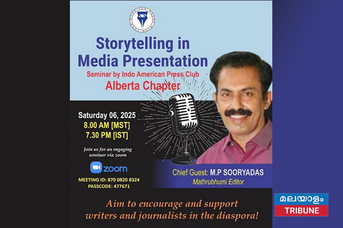 കാൽഗറി : ഇൻഡോ അമേരിക്കൻ പ്രെസ്സ് ക്ലബ് ആൽബെർട്ട ചാപ്റ്ററിന്റെ നേതൃത്വത്തിൽ സെമിനാർ "കഥ പറച്ചിൽ " സെപ്തംബർ 6 , ശനിയാഴ്ച്ച രാവിലെ 8 .00 (M S T) ന് സൂമിൽ സംഘടിപ്പിക്കുന്നു. പ്രമുഖ പത്രപ്രവർത്തകനും , മാതൃഭൂമി എഡിറ്ററുമായ എം.പി സൂര്യദാസ് മുഖ്യാതിഥി ആയിരിക്കും . പങ്കെടുക്കാൻ താത്പ്പര്യപ്പടുന്നവർ www.indoamericanpressclub.com/albertaseminar എന്ന ലിങ്ക് ഉപയോഗിച്ചോ , (Meeting ID: 870 0820 8324 Passcode: 477671) പാസ്സ്കോഡ് ഉപയോഗിച്ചോ പങ്കെടുക്കാവുന്നതാണ് .
