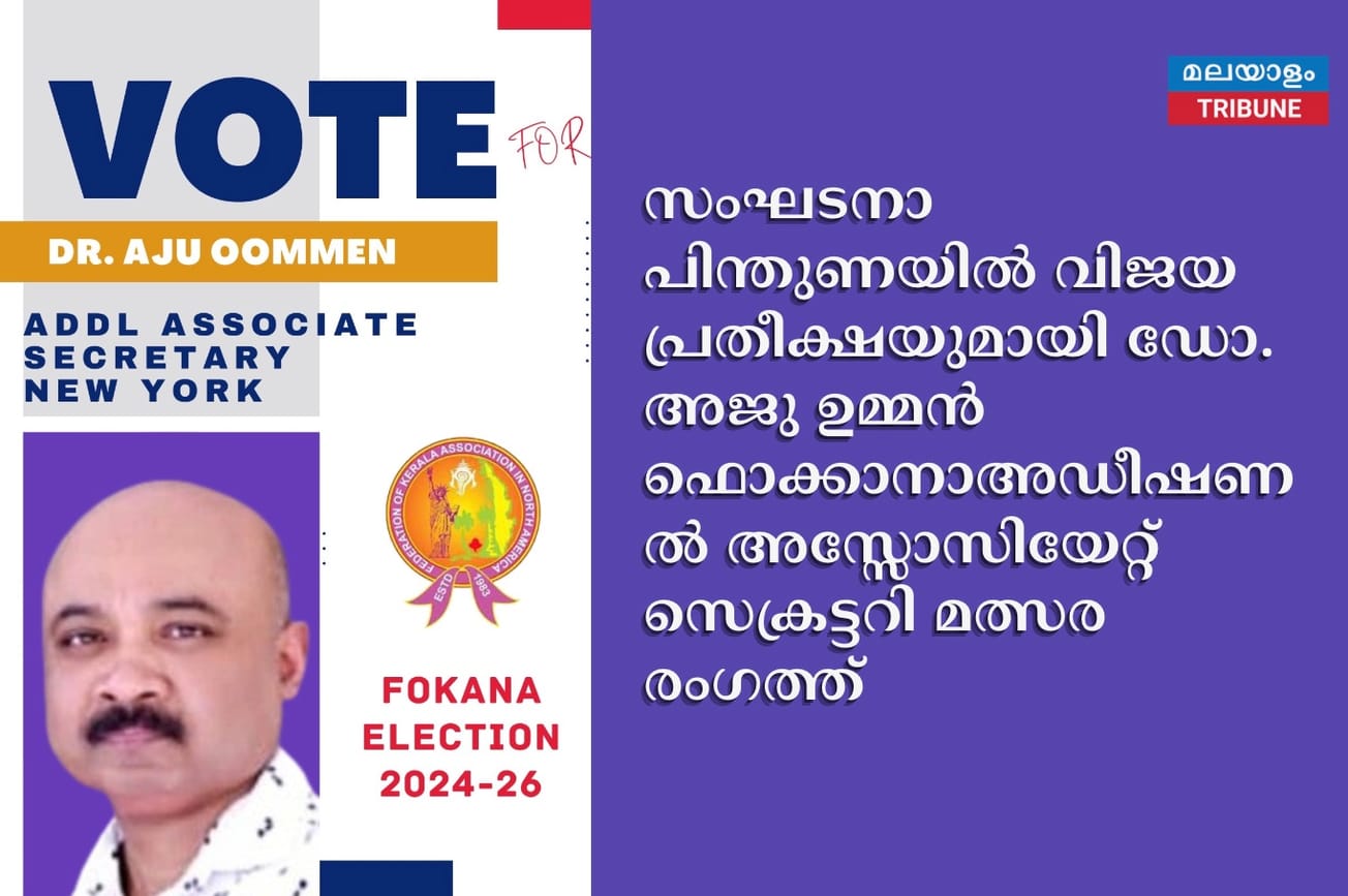 ഈ മാസം 18 മുതൽ 21 വരെ വാഷിങ്ടൺ ഡി.സി-യിൽ അതിഗംഭീരമായി സംഘടിപ്പിക്കപ്പെടുന്ന ഫൊക്കാനാ ദ്വൈ വാർഷിക കോൺഫെറെൻസിൽ 19-ന് വെള്ളിയാഴ്ചയാണ് വിവിധ സ്ഥാനങ്ങളിലേക്കുള്ള തെരഞ്ഞെടുപ്പ് നടക്കുന്നത്. നിലവിലെ ഫൊക്കാനാ ജനറൽ സെക്രട്ടറിയും അടുത്ത രണ്ടു വർഷത്തേക്ക് പ്രസിഡൻറ് സ്ഥാനാർഥിയായി മത്സരിക്കുന്നതുമായ ഡോ. കലാ ഷാഹിയുടെ പാനലിലാണ് ഡോ. അജുവും മത്സരിക്കുന്നത്. ഡോ. കലാ ഷാഹിക്കും സഹ സ്ഥാനാർഥികൾക്കും ഭൂരിഭാഗം സംഘടനകളിൽ നിന്നും വളരെ പ്രതീക്ഷാ നിർഭരമായ പിന്തുണ ലഭിക്കുന്നതിനാൽ ഡോ. അജുവിനും നൂറു ശതമാനം വിജയ പ്രതീക്ഷയാണ് കാണുന്നത്.