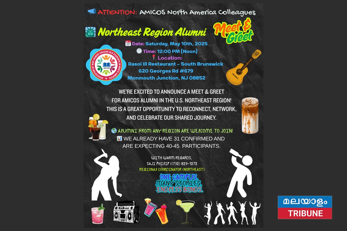ന്യൂയോർക്ക് : തിരുവനന്തപുരം മാർ ഇവാനിയോസ് കോളേജ് പൂർവ്വ വിദ്യാർത്ഥി സംഘടന ആയ അസോസിയേഷൻ ഓഫ് മാർ ഇവാനിയോസ് കോളേജ് ഓൾഡ് സ്റ്റുഡൻസ് (അമിക്കോസ് ) നോർത്ത് ഈസ്റ്റ് റീജിയണലിന്റെ നേതൃത്വത്തിൽ പൂർവ്വ വിദ്യാർത്ഥികളുടെ ഒരു ഒത്തുകൂടൽ ന്യൂജേഴ്സി റിസോയ് റസ്റ്റോറന്റിൽ വെച്ച് (South Brunswick, 620 Georges Rd # 679, Monmouth Jn, NJ 08852) മെയ് 10 ശനിയാഴ്ച ഉച്ചക്ക് 12 മണി മുതൽ നടത്തപ്പെടും.