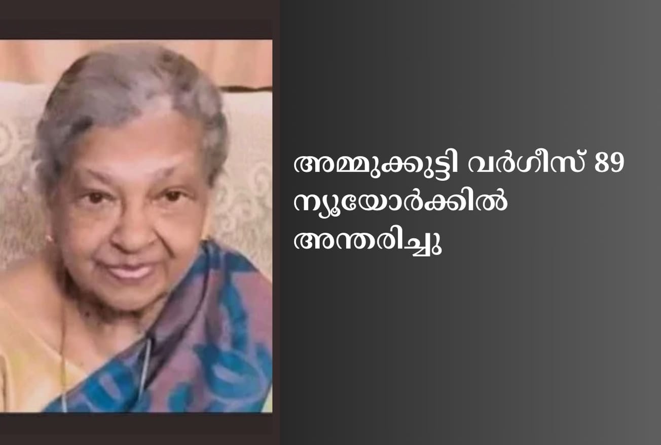 ന്യൂയോര്ക്ക്: അമ്മുക്കുട്ടി വര്ഗീസ് (89) ന്യൂയോര്ക്കില് അന്തരിച്ചു. പൊതുദര്ശനം മാര്ച്ച് 30 ശനിയാഴ്ച പാര്ക്ക് ഫ്യൂണറല് ചാപ്പല്സില് (Park Funeral Chapels
