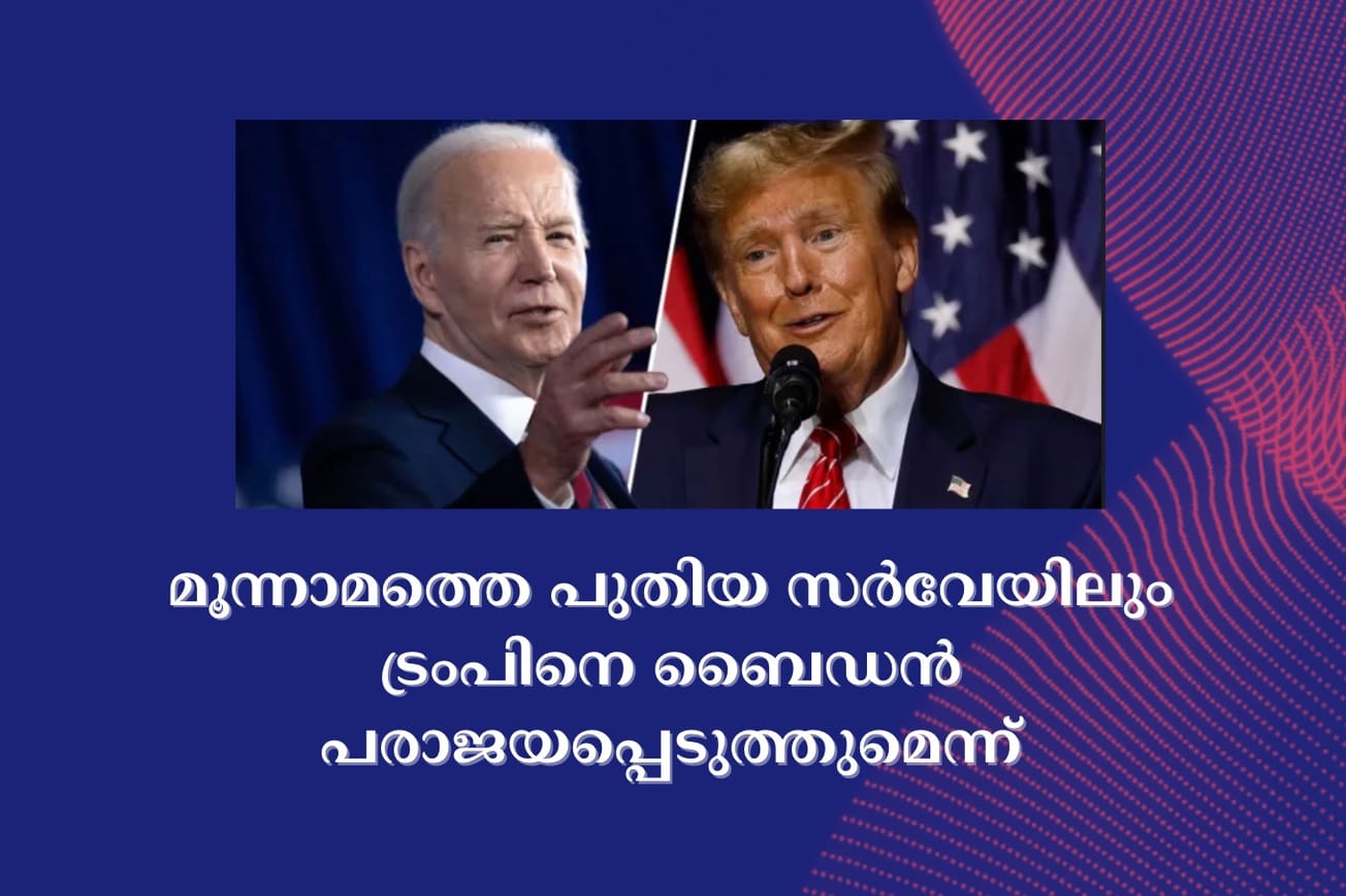 ന്യൂയോർക് :വരാനിരിക്കുന്ന പ്രസിഡൻ്റ് തെരഞ്ഞെടുപ്പിൽ പ്രസിഡൻ്റ് ജോ ബൈഡൻ ഡൊണാൾഡ് ട്രംപിനെ പരാജയപ്പെടുത്തുമെന്ന് പുതിയ സർവേ സൂചിപ്പിക്കുന്നു, കഴിഞ്ഞ ആഴ്ചയിൽ ഒരേപോലെ പ്രവചനം നടത്തുന്ന മൂന്നാമത്തെ സർവേയാണിത്.