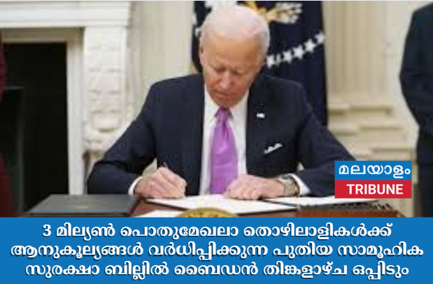 വാഷിംഗ്ടൺ ഡി സി :3 മില്യൺ പൊതുമേഖലാ തൊഴിലാളികൾക്ക് ആനുകൂല്യങ്ങൾ വർധിപ്പിക്കുന്ന പുതിയ സാമൂഹിക സുരക്ഷാ ബില്ലിൽ , പ്രസിഡൻ്റ് ബൈഡൻ തിങ്കളാഴ്ച ഒപ്പിടും.