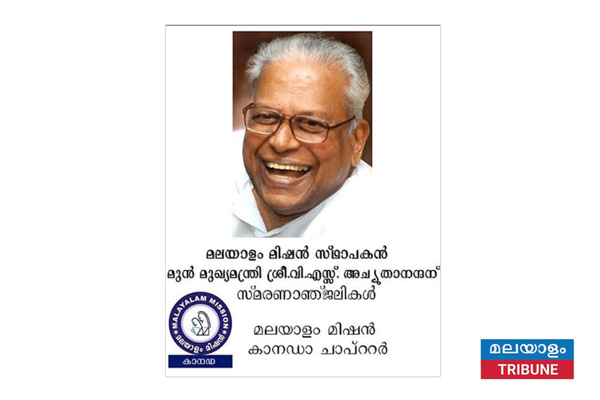 കാൽഗറി : മലയാളം മിഷൻ സ്ഥാപകനും മുൻ മുഖ്യമന്ത്രിയുമായിരുന്ന ശ്രീ വി.എസ്സ് അച്യുതാന്ദനെ അനുസ്മരിച്ചു് കാനഡ ചാപ്റ്റർ . ലോകമെമ്പാടുമുള്ള കേരളീയരുടെ പുതുതലമുറയ്ക്ക് മലയാളം ഭാഷ പഠിക്കാനും, മലയാള നാടിന്റെ സംസ്കാരം പകർന്നുകൊടുക്കാനും വേണ്ടി ദീർഘവീക്ഷണത്തോടെ ശ്രീ വി.എസ്സ് അച്യുതാന്ദൻ 2009 , ജൂൺ 2 ന് ഉത്ഘാടനം ചെയ്ത , ഇന്ന് ലോകമെമ്പാടും അമ്പതിനായിരത്തിൽപരം പഠിതാക്കൾ ഭാഗമായിരിക്കുന്ന മലയാളം മിഷൻറെ സ്ഥാപകനെ മലയാളം മിഷൻ കാനഡ ചാപ്റ്റർ പ്രവർത്തകർ അനുസ്മരിച്ചു.