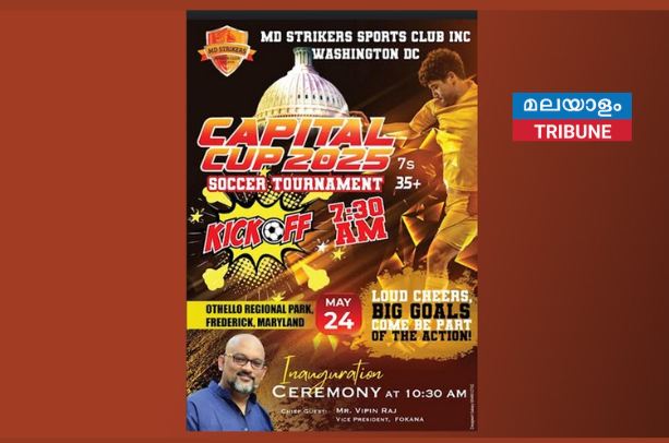വാഷിംഗ്ടൺ ഡി സി : മേരിലാൻഡ് സ്ട്രൈക്കേഴ്സ് മെയ് 24 ന് നടത്തുന്ന നോർത്ത് അമേരിക്കൻ ക്യാപിറ്റൽ സോക്കർ ടൂർണമെന്റിനുള്ള ഒരുക്കങ്ങൾ പൂർത്തിയായതായി സംഘാടക സമിതി അറിയിച്ചു.