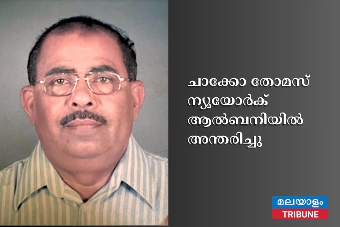ആൽബനി(ന്യൂയോർക്): കോട്ടയം മഞ്ചേരി കടമ്പനാട്ട് ചാക്കോ തോമസ്(അച്ചൻ 76) ആൽബനിയിൽ അന്തരിച്ചു.ആൽബനി സെന്റ് പോൾസ് ഓർത്തഡോൿസ് ചർച്ച അംഗമാണ്.സാമൂഹ്യ സാംസ്കാരിക രംഗത്ത് സജീവസാനിധ്യമായിരുന്ന അച്ചൻ ആൽബനി കേരള അസോസിയേഷൻ സ്ഥാപകാംഗം, അൽബാനി എക്യൂമിനിക്കൽ കോൺഗ്രിഗേഷൻ സ്ഥാപകാംഗം എന്നീ നിലകളിൽ പ്രവർത്തിച്ചിട്ടുണ്ട്