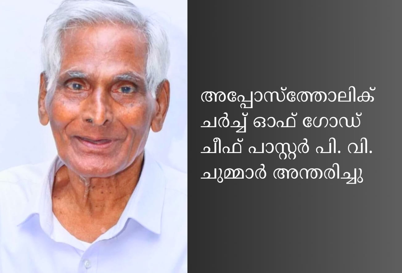 പഴഞ്ഞി(തൃശൂർ) : ക്രൈസ്തവ ഗാനരചയിതാവും , അപ്പൊസ്തൊലിക്ക് ചർച്ച് ഓഫ് ഗോഡ് അധ്യക്ഷനുമായ പാസ്റ്റർ പി.വി.ചുമ്മാർ (92) അന്തരിച്ചു.ഇന്ത്യൻ സമയം മാർച്ച് 13 ബുധനാഴ്ച രാവിലെ പഴഞ്ഞി ഫൈത് ഹോമിൽ വെച്ചായിരുന്നു മരണം സംഭവിച്ചത് .പഴഞ്ഞി പുലിക്കോട്ടിൽ വറുതുണ്ണി - ചെറിച്ചി ദമ്പതികളുടെ മകനായി 1932 ഓഗസ്റ്റ് 20നാണ് ജനനം.