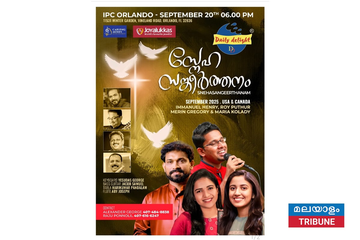 ഫ്ളോറിഡ: ക്രിസ്തീയ സംഗീത ലോകത്തെ പ്രമൂഖ ഗായകരായ ഇമ്മാനുവേൽ ഹെൻറി, റോയി പുത്തൂർ സംഘവും അവതരിപ്പിക്കുന്ന "സ്നേഹ സങ്കീർത്തനം "സംഗീത ആലാപനം സെപ്റ്റംബർ 20 ന് ശനിയാഴ്ച വൈകിട്ട് 6 മുതല് ഒര്ലാന്റോ ഐ.പി.സി ചര്ച്ചില് വെച്ച് നടത്തപ്പെടും.