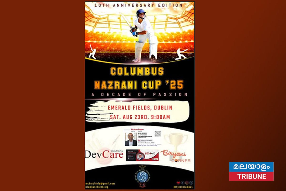 കൊളംബസ് (ഒഹായോ): സെന്റ് മേരീസ് സിറോ മലബാര് കത്തോലിക്ക മിഷന്റെ നേതൃത്വത്തില് സംഘടിപ്പിക്കുന്ന സിഎൻസി ക്രിക്കറ്റ് ടൂർണമെന്റ് ഈ വർഷം പത്താം വാർഷികത്തിലേക്ക് കടക്കുന്നു. മത്സരങ്ങൾ ഓഗസ്റ്റ് 23-ന് (ശനിയാഴ്ച) ഡബ്ലിൻ (ഒഹായോ, യുഎസ്എ) എമറാൾഡ് ഫീൽഡിൽ നടക്കും.