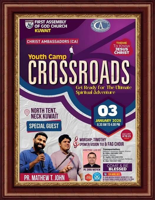 കുവൈറ്റ് സിറ്റി : ഫസ്റ്റ് അസംബ്ലി ഓഫ് ഗോഡ് ചർച്ച് കുവൈറ്റ് സഭയുടെ യുവജന വിഭാഗമായ ക്രൈസ്റ്റ് അംബാസ്സഡർസ് (സി എ) 8 വയസ്സ് മുതൽ 25 വയസ്സ് വരെയുള്ള യുവജനങ്ങൾക്ക് വേണ്ടി പ്രത്യേകമായി ഒരുക്കുന്ന യൂത്ത് ക്യാമ്പ് "CrossRoads" 2026 ജനുവരി 3 ശനിയാഴ്ച്ച കുവൈറ്റ് സിറ്റിയിലുള്ള നാഷണൽ ഇവാൻജെലിക്കൽ ചർച്ച് കോമ്പൗണ്ടിലെ (എൻ ഇ സി കെ) നോർത്ത് റ്റെൻറ്റിൽ വച്ച് രാവിലെ 8.30 മണി മുതൽ വൈകിട്ട് 4 മണി വരെ നടക്കും. ഈ യൂത്ത് ക്യാമ്പിന്റെ തീം "To Know Jesus Christ" / "യേശു ക്രിസ്തുവിനെ അറിയുക" എന്നതാണ്.
