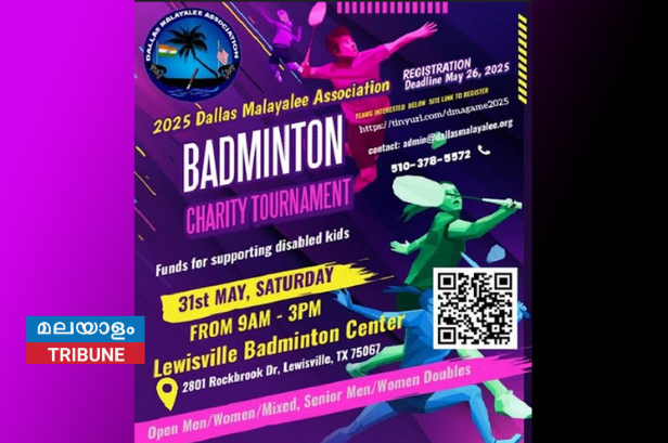 ഡാലസ്: ഡാലസ് മലയാളി അസോസിയേഷന്റെ നേതൃത്വത്തില് നടക്കുന്ന 2025 ലെ ഡിഎംഎ ദേശീയ ബാഡ്മിന്റന് ചാമ്പ്യന്ഷിപ്പ് മത്സരം മെയ് 31, ശനിയാഴ്ച രാവിലെ 9 മണിക്ക് ഡാലസിനടുത്തുള്ള ലൂയിസ്വില് ബാഡ്മിന്റന് സെന്ററില് നടക്കും. ടെക്സസിലെ വിവിധ നഗരങ്ങളില് നിന്നുമെത്തുന്ന നൂറോളം ബാഡ്മിന്റന് താരങ്ങള് പങ്കെടുക്കുന്ന മത്സരം അസോസിയേഷന് പ്രസിഡന്റ് ജൂഡി ജോസ് ഉത്ഘാടനം ചെയ്യും.