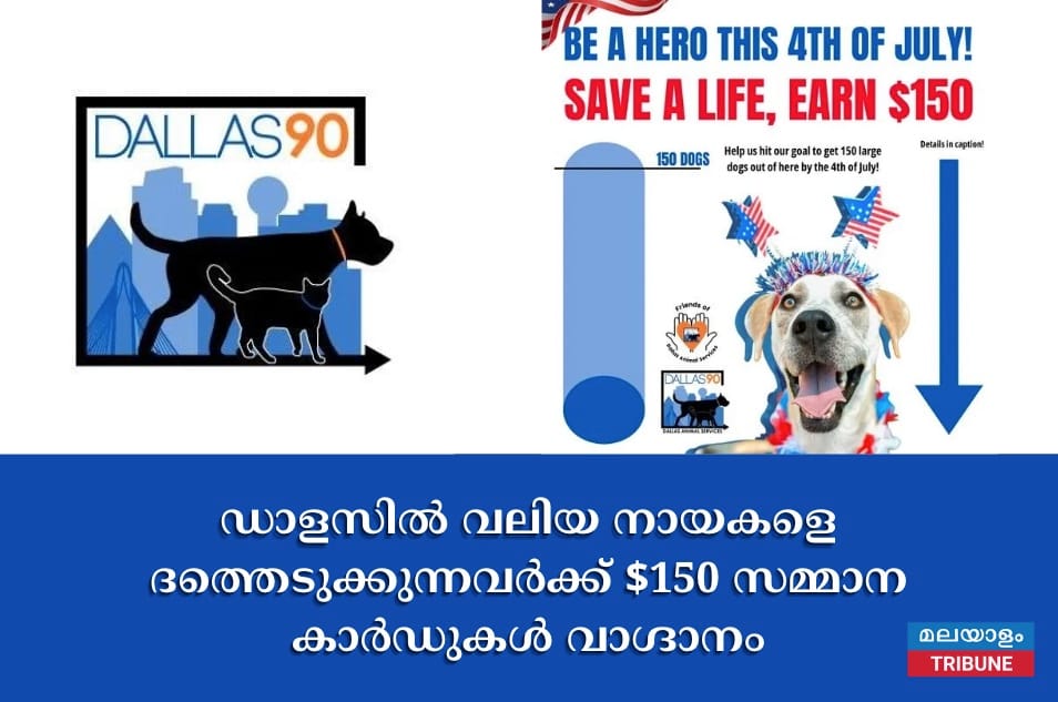 ഡാളസ്:ഡാളസ് അനിമൽ സർവീസസ് വലിയ നായകളെ ദത്തെടുക്കുന്നവർക്ക് $150 സമ്മാന കാർഡുകൾ വാഗ്ദാനം ചെയ്യുന്നു.ഡാളസ് അനിമൽ സർവീസസ് ജൂലായ് നാലിന് നൂറുകണക്കിന് നായ്ക്കളെ ഏറ്റെടുക്കുമെന്ന് പ്രതീക്ഷിക്കുന്നതിനാൽ കൂടുതൽ നായകളെ ഒഴിവാക്കേണ്ടതു ആവശ്യമാണെന്നും ആയതിനാൽ ചില ദത്തെടുക്കലുകൾക്കും രക്ഷാപ്രവർത്തനങ്ങൾക്കുമായി $150 സമ്മാന കാർഡുകൾ വാഗ്ദാനം ചെയ്യുന്നതെന്നും . സിറ്റി ഷെൽട്ടർ പറഞ്ഞു.
