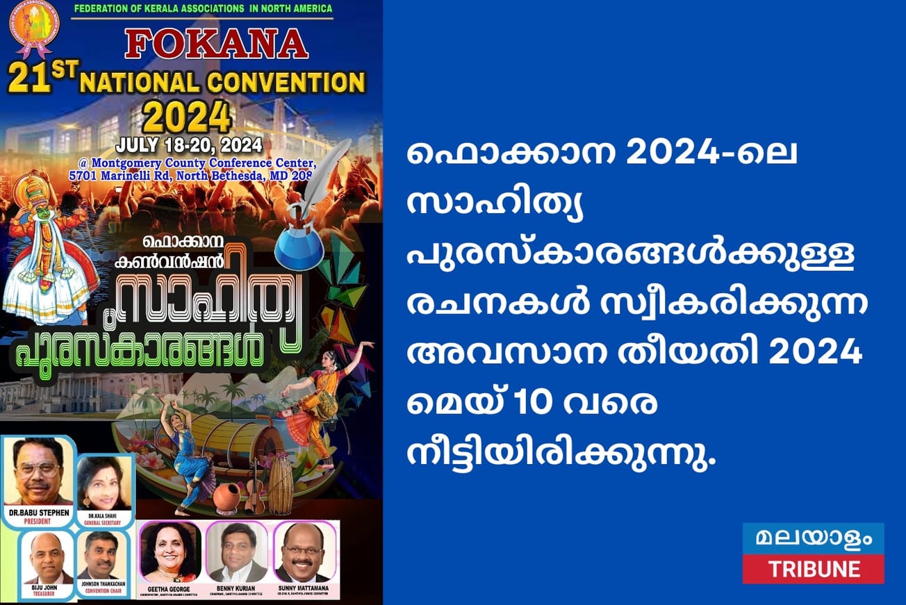 വാഷിംഗ്ടൺ ഡി സി : അമേരിക്കയിലെ ഏറ്റവും ജനപ്രിയ സാഹിത്യ പുരസ്ക്കാരങ്ങൾ എന്നു വിശേഷിപ്പിക്കുന്ന ഫൊക്കാന സാഹിത്യ പുരസ്കാരത്തിനുള്ള രചനകൾസ്വീകരിക്കുന്ന അവസാന തീയതി 2024 മെയ് 10 വരെ നീട്ടിയാതായി അറിയിക്കുന്നു.