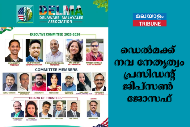 ഡെലാഡെയർ: മെയ് 17 തീയതി കൂടിയ ഡെൽമ (DELMA – Delaware Malayalee Association) ജനറൽ ബോഡിയോഗം 2025-ലെ ഭരണസമിതിയെ തിരഞ്ഞെടുത്തു.പ്രസിഡന്റ് ജിപ്സൺ ജോസഫ് , വൈസ് പ്രസിഡന്റ് രാജി മാത്യു , സെക്രട്ടറി സുജിത് മുരുകൻ, പ്രവീൺ ഗോവിന്ദൻ ജോയിന്റ് സെക്രട്ടറി, തോമസ് പൂട്ടതങ്കൾ ട്രഷർ ആയും സിമി സൈമൺ കൾച്ചറൽ കോർഡിനേറ്റർ ആയും തെരെഞ്ഞെടുത്തു