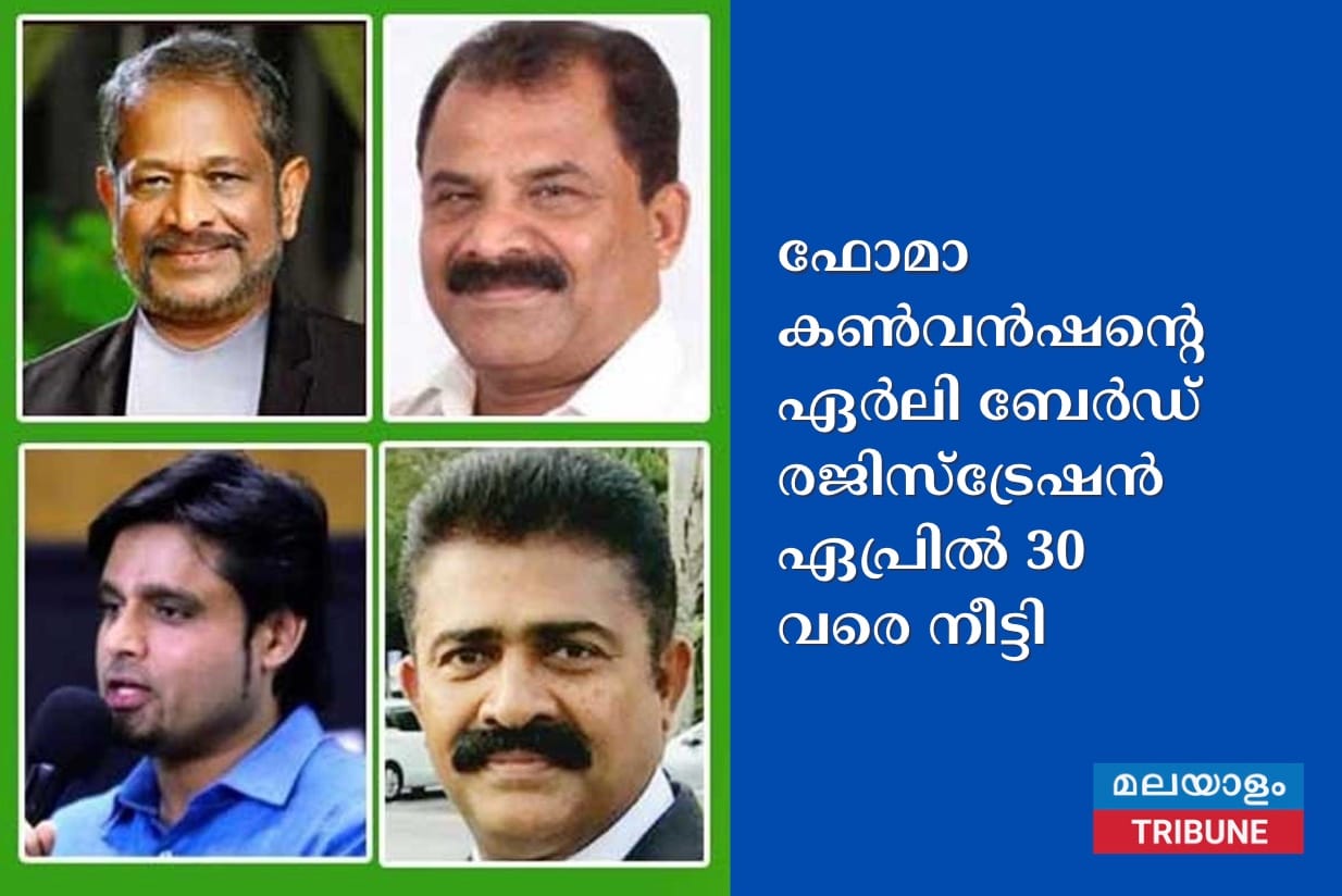 ന്യു യോർക്ക്: ഓഗസ്റ്റ് 8 മുതൽ 11 വരെ നടക്കുന്ന ഫോമാ കൺവൻഷന്റെ ഏർലി ബേർഡ് രജിസ്ട്രേഷൻ ഏപ്രിൽ 30 വരെ നീട്ടാൻ തീരുമാനിച്ചതായി പ്രസിഡന്റ് ഡോ. ജേക്കബ് തോമസും കൺവൻഷൻ ചെയർ കുഞ്ഞു മാലിയിലും അറിയിച്ചു. ഏർലി ബേർഡ് രജിസ്ട്രേഷൻ മാർച്ച് 31 വരെ എന്നാണു നേരത്തെ അറിയിച്ചിരുന്നത്. എന്നാൽ പലർക്കും ഇതിനകം രജിസ്റ്റർ ചെയ്യാൻ കഴിഞ്ഞിട്ടില്ലെന്നും സമയപരിധി നീട്ടണമെന്നും പ്രാദേശിക സംഘടനകളും മറ്റും ആവശ്യപ്പെട്ടതിനെത്തുടർന്നാണ് തീയതി നീട്ടിയത്.