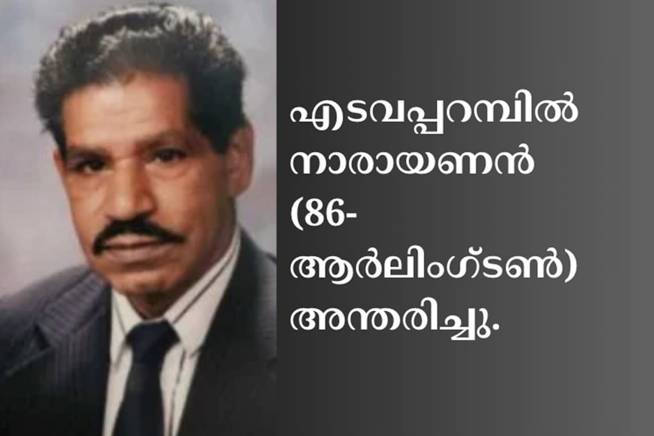 ആര്ലിംഗ്ടണ്: എടവപ്പറമ്പില് നാരായണന് (86) ആര്ലിംഗ്ടണില് അന്തരിച്ചു. മാര്ട്ടിനയാണ് ഭാര്യ. മക്കള് ഫിയോന, മായ. മരുമക്കള് ഷെയ്ന്, സീയന്. കൊച്ചുമക്കള് മിലാനാ, ആഷാ. സഹോദരങ്ങള് ഡെബി, ചന്ദ്ര.