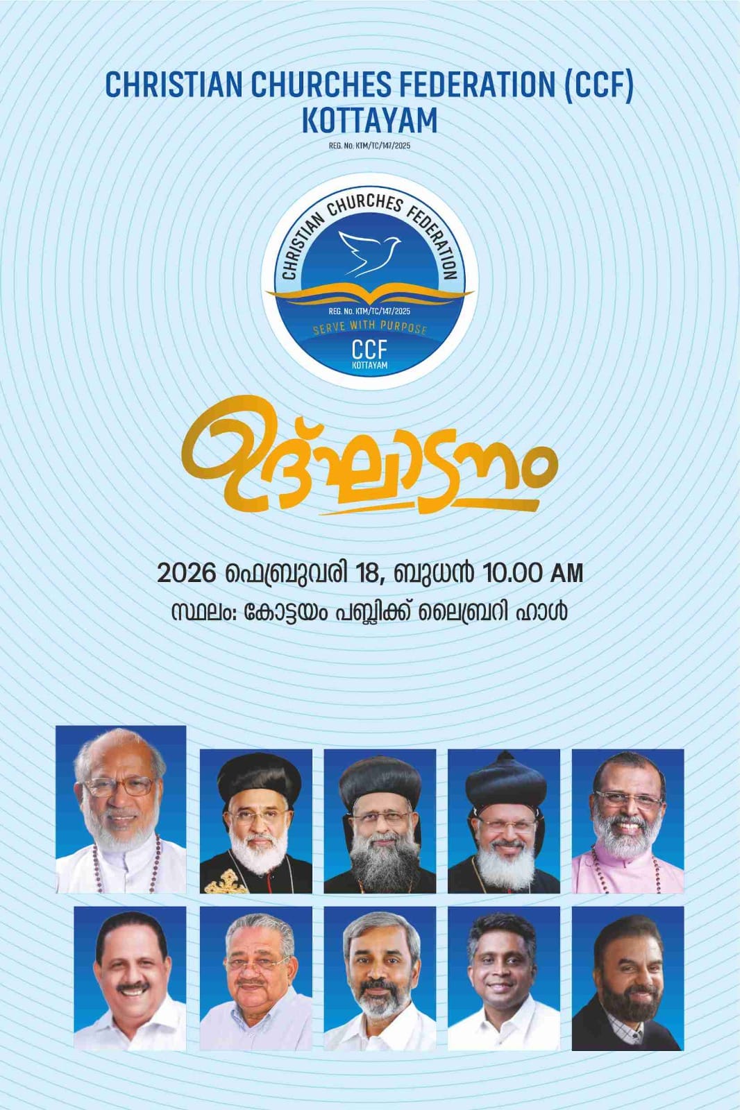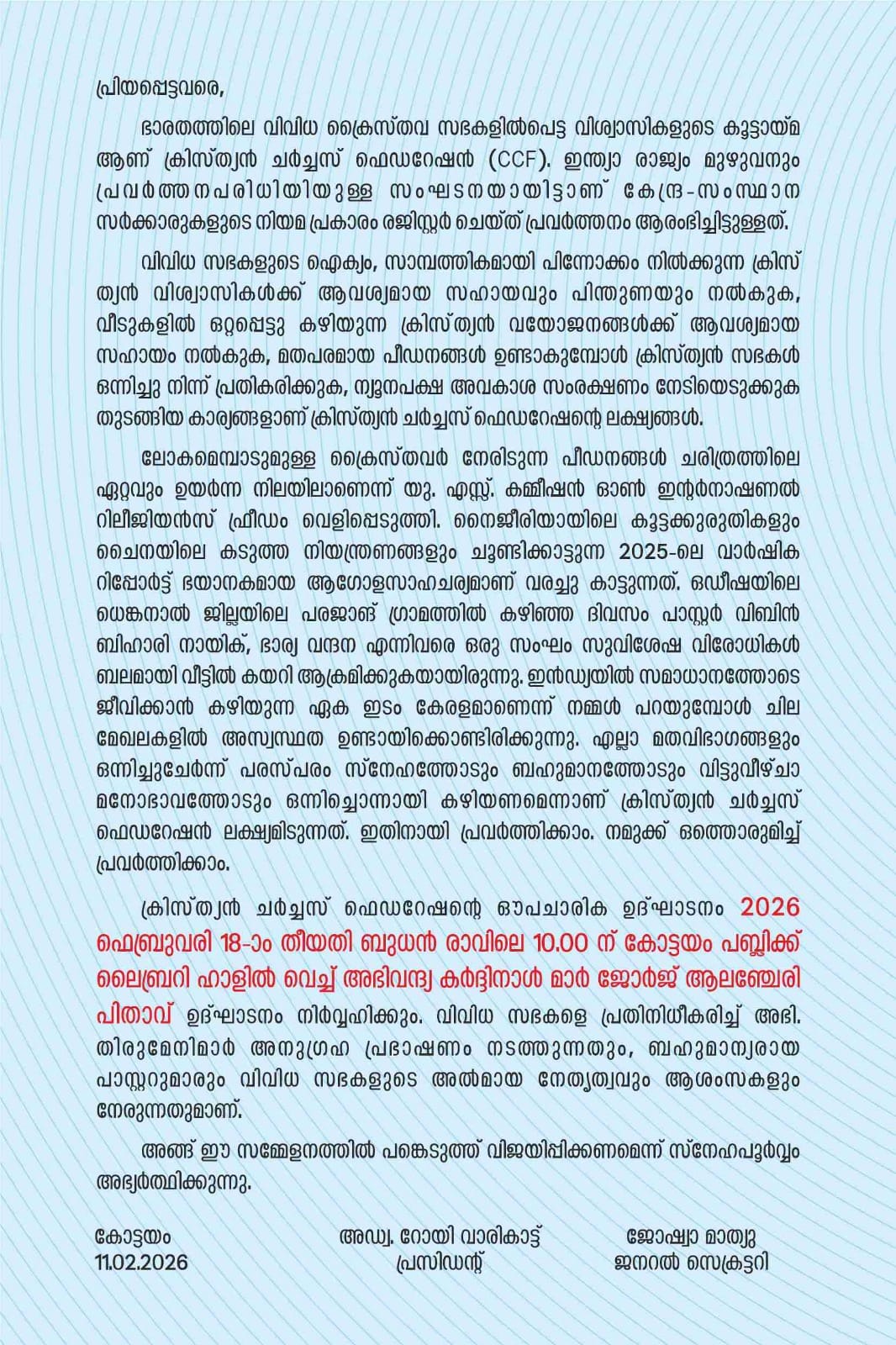 ക്രിസ്ത്യൻ ചർച്ചസ് ഫെഡറേഷൻ്റെ ഔപചാരിക ഉദ്ഘാടനം 2026 ഫെബ്രുവരി മാസം 18-ാം തീയതി ബുധനാഴ്ച രാവിലെ 10.00 മണിക്ക് കോട്ടയം പബ്ലിക്ക് ലൈബ്രറി ഹാളിൽ സീറോ മലബാർ സഭ മുൻ അദ്ധ്യക്ഷൻ കർദ്ദിനാൾ മാർ ജോർജ്ജ് ആലഞ്ചേരി നിർവഹിക്കും. പ്രസിഡൻ്റ് അഡ്വ. റോയി വാരിക്കാട്ടിന്റെ അദ്ധ്യക്ഷതയിൽ മലങ്കര യാക്കോബ സഭ ഡോ. തോമസ് മാർ തിമോത്തിയോസ് മെത്രാപ്പോലീത്താ, ക്നനായ സമുദായ അദ്ധ്യക്ഷൻ കുര്യാക്കോസ് മാർ സേവറി യോസ് വലിയ മെത്രാപ്പോലീത്താ, മലങ്കര ഓർത്തഡോക്സ് സഭ ഡോ. യൂഹാ ന്നോൻ മാർ ദിയസ് കൊറോസ് മെത്രാപ്പോലീത്താ, സി.എസ്.ഐ മദ്ധ്യകേരള മഹാ യിടവക അദ്ധ്യക്ഷൻ ഡോ. മലയിൽ സാബു കോശി ചെറിയാൻ, എം.ജി.എം. ഗ്രൂപ്പ് ചെയർമാൻ ഡോ. ഗീവർഗീസ് യോഹന്നാൻ, ഓർത്തഡോക്സ് സഭാ അസോസിയേ ഷൻ സെക്രട്ടറി അഡ്വ. ബിജു ഉമ്മൻ, മലങ്കര മർത്തോമ്മാ സഭ അത്മായ ട്രസ്റ്റി അഡ്വ. അൻസിൽ കോമാട്ട്, ഫെഡറേ ഷൻ ഓഫ് ഇൻഡ്യൻ അമേരിക്കൻ ക്രിസ്ത്യൻ ഓർഗനൈസേഷൻ (ഫിയക്കോണ) അഡ്വക്കസി ഡയറക്ടർ സ്റ്റാൻലി ജോർജ്ജ്, ക്രിസ്ത്യൻ ബിസിനസ് ഫോറം ഗ്ലോബൽ കോഓർഡിനേറ്റർ ശ്രീ.സേവ്യർകുട്ടി പുത്തേത്ത്, തോമസ് ജോൺസൺ കോർ എപ്പിസ്ക്കോപ്പാ, ഡോ. റ്റി. റ്റി. പ്രവീൺ, ഫാ. മാത്യുസ് കെ. ജോർജ്ജ്, പാസ്റ്റർ തോംസൺ പി. ജോഷ്വാ, എം. പി. ജോർജ്ജ് കോറെപ്പിസ്ക്കോപ്പാ, ഫാ. ജോസ് ബെയ്സിൽ പ്ലാത്തോട്ടം, പാസ്റ്റർ അനി ജോർജ്ജ്, രാജൻ കണ്ണാട്ട്, പാസ്റ്റർ ഫെയ്ത്ത്സൺ വർഗീസ്, പാസ്റ്റർ സജി മുട്ടം, പാസ്റ്റർ ഷാജി ജോർജ്ജ്, രാജു കെ. തോമസ്, അച്ചൻകുഞ്ഞ് ഇലന്തൂർ എന്നിവർ പ്രസംഗിക്കും.