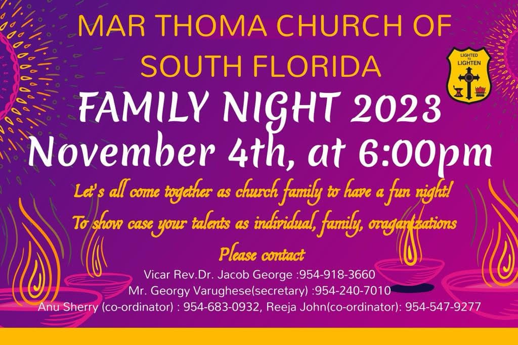 ഫോർട്ട് ലോഡർഡൽ: മാർ തോമാ ചർച്ച് ഓഫ് സൗത്ത് ഫ്ലോറിഡായുടെ ഫാമിലി നൈറ്റ് വിവിധ കലാപരിപാടികളോട് നവംബർ 4 നു(ഇന്ന് ) 6 PM ന് നടത്തുന്നതാണ്. പള്ളിയിലെ അംഗങ്ങളും കുടുംബങ്ങളും ചേർന്ന് ഗാനങ്ങൾ, കവിതകൾ, ഡാൻസുകൾ, സ്കിട്, കോസ്റ്റും ഷോ, കപ്പിൾ ഡാൻസ് തുടങ്ങി ഒട്ടേറെ നിരവധി പുതുമ നിറഞ്ഞ വിവിധ കലാപരിപാടികൾ ആണ് ചിട്ടപ്പെടുത്തിയിട്ടുള്ളത് .ഈ ഫാമിലി നൈറ്റ് വിജയപ്രദമാക്കാൻ നിങ്ങളുടെ സഹായ സഹകരണം അവിശ്വമാണെന്ന് വികാരി റവ. ഡോ. ജേക്കബ് ജോർജ്, സെക്രട്ടറി ജോർജി വർഗീസ്, പ്രോഗ്രാം കോർഡിനേറ്റർസ് ആയ അനു ഷെറി, റീജാ ജോൺ എന്നിവർ അറിയിച്ചു.
