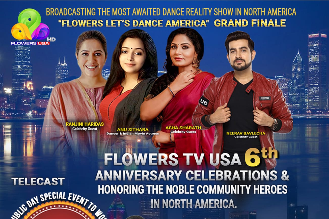 ഷിക്കാഗോ: ലോക മലയാളികള്ക്കായി മായാത്ത ദൃശ്യവിസ്മയമൊരുക്കുകയും അമേരിക്കന് മലയാളികള് നെഞ്ചേറ്റിയതുമായ ഫ്ളവേഴ്സ് ടി.വി യു.എസ്.എയുടെ ആറാം വാര്ഷികാഘോഷരാവില്, അമേരിക്കന് മണ്ണില് താരത്തിളക്കത്തിന്റെ വര്ണരാജി വിതാനിച്ച മെഗാ ഷോ, ലയലാസ്യ ഭംഗിയോടെ നൃത്തമയൂരികള് നിറഞ്ഞാടിയ ലെറ്റ്സ് ഡാന്സ് അമേരിക്ക റിയാലിറ്റി ഷോയുടെ ഗ്രാന്റ് ഫിനാലെ, കമ്മ്യൂണിറ്റി ഹീറോസിനെ ആദരിക്കല് തുടങ്ങിയ പരിപാടികള് ഇന്ത്യന് റിപ്പബ്ളിക് ഡേയില് ഫ്ളവേഴ്സ് ടി.വി യു.എസ്.എ ലോക മലയാളികള്ക്കായി ടെലികാസ്റ്റ് ചെയ്യുന്നു.
