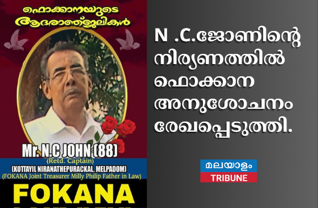 ന്യൂ യോർക്ക് : ഫൊക്കാനയുടെ അഡിഷണൽ ജോയിന്റ് ട്രഷർ മില്ലി ഫിലിപ്പിന്റെ ഫാദർ ഇൻ ലോയും , ഫിലിപ്പ് ജോണിന്റെ പിതാവുമായ റിട്ടയേർഡ് ക്യാപ്റ്റൻ കോട്ടയിൽ നിരണത്തെപുരക്കൽ N .C.ജോണിന്റെ നിര്യണത്തിൽ ഫൊക്കാന അനുശോചനം രേഖപ്പെടുത്തി.
