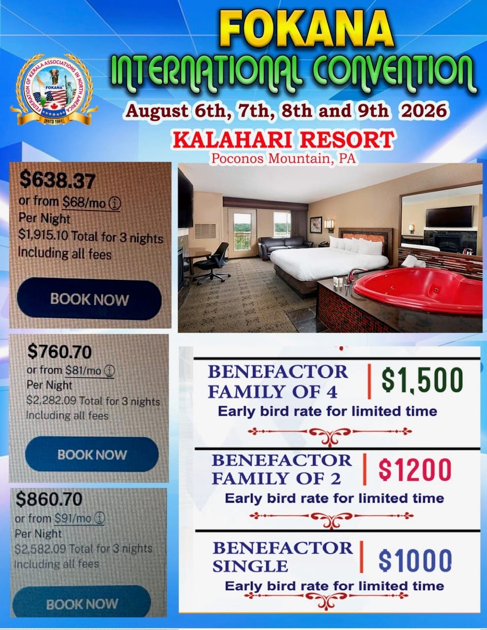 ലോകത്തിലെ ഏറ്റവും വലിയ ഇൻഡോർ ആൻഡ് ഔട്ട് ഡോർ വാട്ടർ പാർക്കാണ് കാലാഹാരി റിസോർട്ട് . പ്രകൃതി ഭംഗികൊണ്ട് അനുഗ്രഹിതമായ പോക്കനോസ് മൗണ്ടൻസിലാണ് ഈ റിസോർട്ട്. അമേരിക്കയുടെ വിവിധ ഭാഗങ്ങളിൽ നിന്നും ഡ്രൈവബിൾ ഡിസ്റ്റൻസ് ആണ് എന്നത് ഏവരെയും പ്രിയങ്കരമാക്കുന്നു. കാലാവസ്ഥയും, രമണീയമായ ഭൂപ്രകൃതിയും , ലോകത്തിലേക്കും ഏറ്റവും വലുതും കുട്ടികൾക്കും വലിയവർക്കും ഒരു പോലെ ആസ്വദിക്കാവുന്ന വാട്ടർ പാർക്കുമാണ് ഏവരെയും പോക്കണോസിനെയും കലാകാരിയെയും വിസ്മയമാക്കുന്നത് . 2026 ലെ ഫാമിലി വെക്കേഷൻ കലഹരിയിൽ ആകട്ടെ ...., ഫൈവ് സ്റ്റാർ റീസർട്ടിലെ താമസം , ഭക്ഷണം , വാട്ടർ പാർക് എൻട്രി ,മാസ്മറിസ് പ്രോഗ്രാംസ് , സ്റ്റേജ് ഷോ . അവാർഡ് നൈറ്റ് , ഗ്രാൻ ഫിനാലെ ഓഫ് യൂവജനോസ്ലാവം തുടഗിയ അനേകം പ്രോഗ്രാമുകൾ ഉൾപ്പെടെ അതിശയിപ്പിക്കുന്ന കലാപരിപാടികൾ ഏവരെയും ഈ കൺവെൻഷൻ സ്വീകാര്യമാക്കുന്നു .