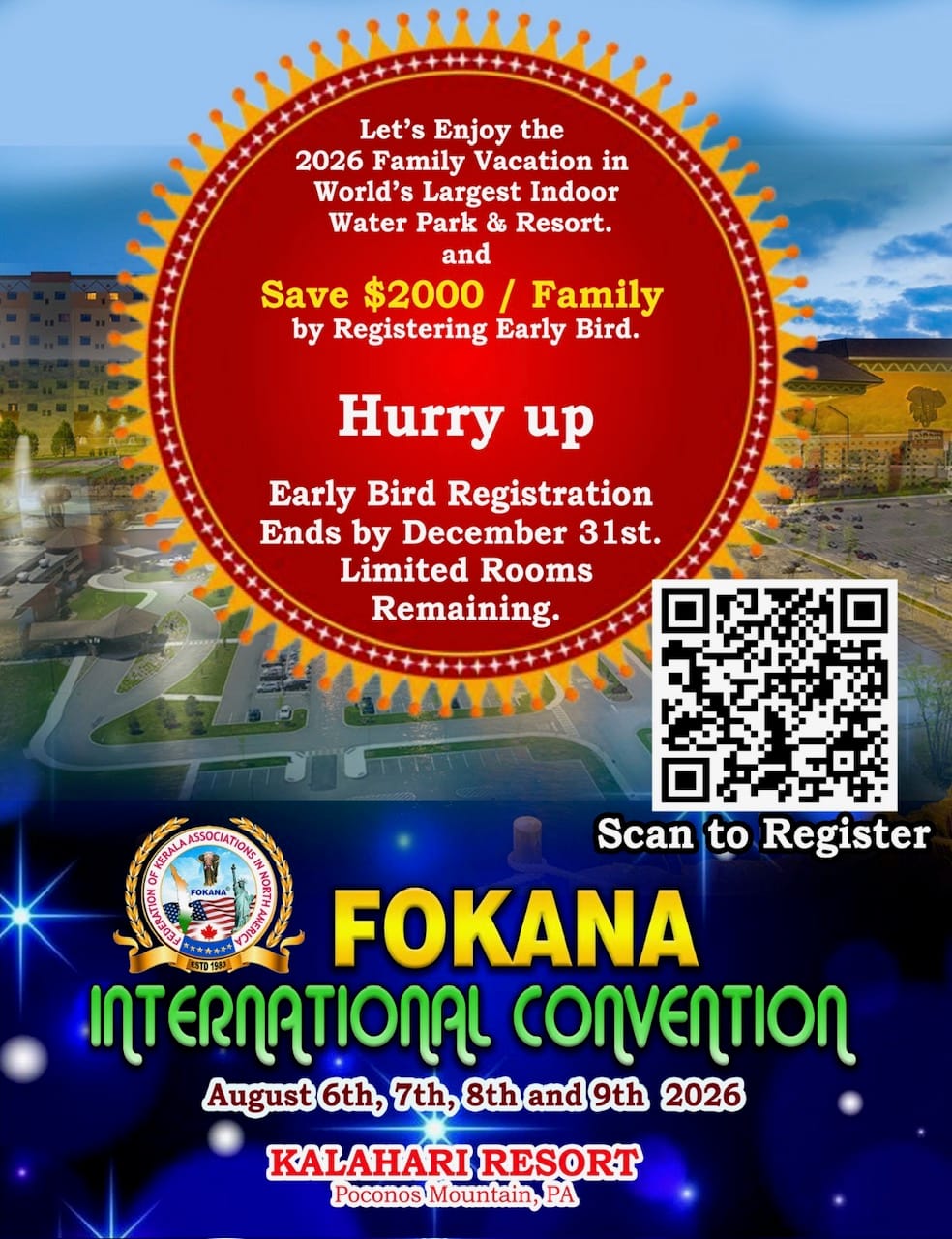 ഒരിക്കലെങ്കിലും നാം അനുഭവിച്ചു അറിയേണ്ടുന്നതാണ്. കുറഞ്ഞ ബഡ്ജറ്റിൽ നാല് ദിവസങ്ങൾ ആഘോഷിക്കാനും ആനന്ദകരമാക്കാനും വേണ്ടി, ഫൊക്കാന കമ്മിറ്റി വിവിധ സ്റ്റേജ് ഷോകൾ, വേൾഡ് തലത്തിലുള്ള സൗന്ദ്യര്യ മത്സരങ്ങൾ, ബ്യുട്ടി പേജന്റ്, അവാർഡ് നൈറ്റുകൾ , ബങ്കാറ്റു നൈറ്റ് എന്ന് വേണ്ട കണ്ടാലും കണ്ടാലും മതിവരാത്ത കലാപരിപാടികൾ ഉൾപ്പെടുത്തിയാണ് ഈ കൺവെൻഷൻ അരങ്ങേറുന്നത്. താഴെകാണുന്ന ലിങ്കിൽ കൂടെയോ അല്ലെങ്കിൽ fokanaonline.org എന്ന വെബ്സൈറ്റിൽ നിന്നോ രജിസ്റ്റർ ചെയ്യാം.