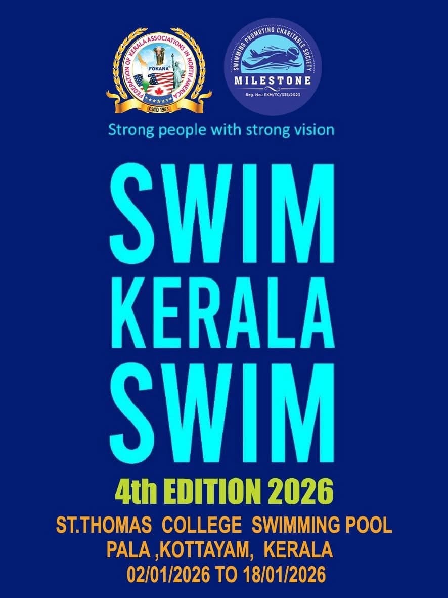 കേരളത്തിലെ ജലസംബന്ധമായ മുങ്ങിമരണങ്ങൾ നിയന്ത്രിക്കുവാൻ അമേരിക്കയിലെ മലയാളി സംഘടനയായ ഫൊക്കാനയുടെ നേതൃത്വത്തിൽ വിവിധ ജില്ലകളിൽ കുട്ടികൾക്കും യുവതി യുവാക്കൾക്കുമായി നൽകിവരുന്ന സൗജന്യ നീന്തൽ പരിശീലനമായ സ്വിം കേരളാ സ്വിം ൻ്റെ ഭാഗമായി പാലാ സെൻ്റ് തോമസ് കോളേജിൻ്റെ നീന്തൽകുളത്തിൽ നടത്തുന്ന പരിശീലന ക്യാമ്പിൻ്റെ ഔദ്യോഗിക ഉദ്ഘാടന ചടങ്ങ് 2026 ജനുവരി പത്താം തീയതി രാവിലെ 7 മണിക്ക് നീന്തൽ കുളത്തിൽ നടക്കും.