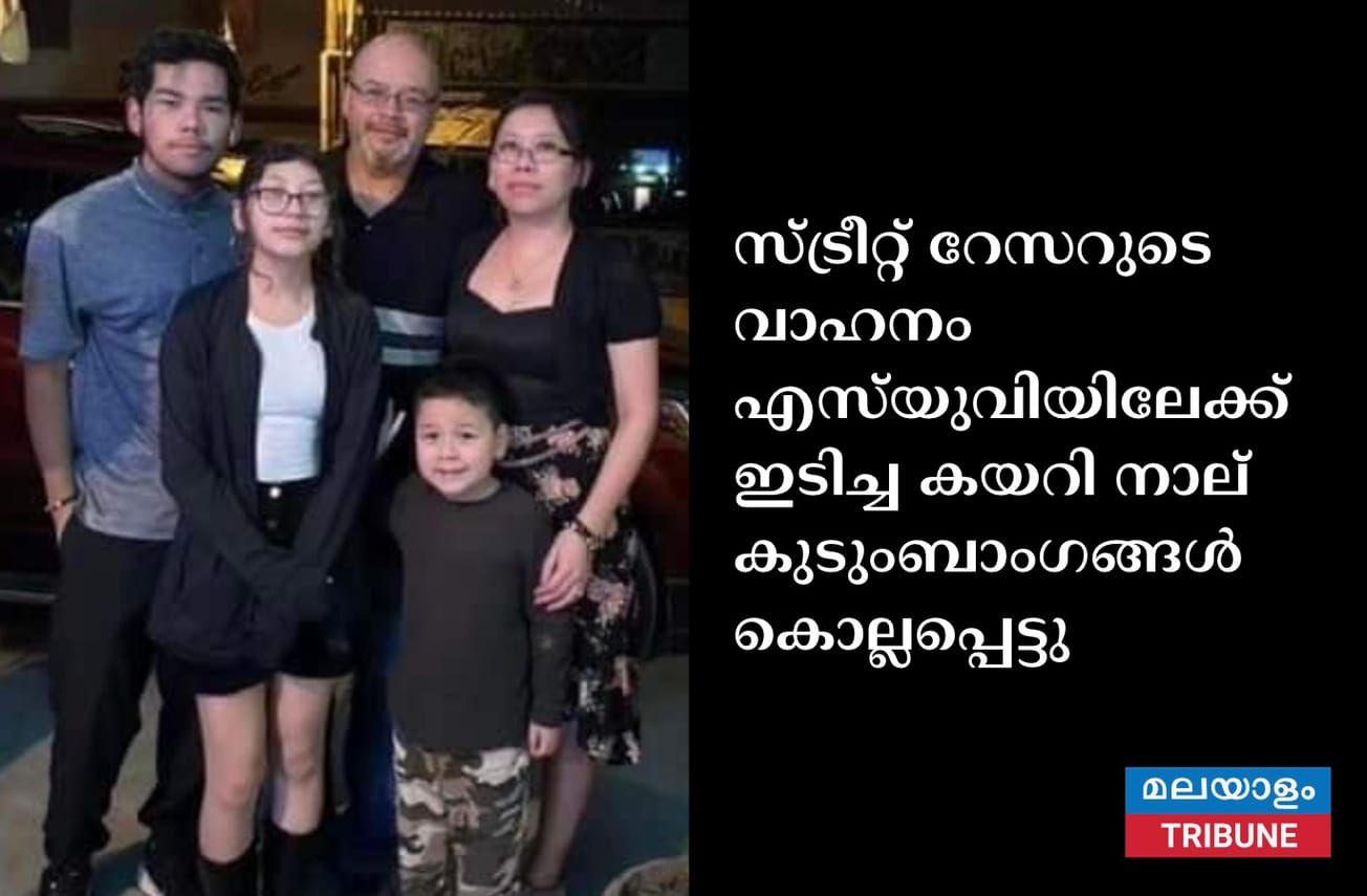 ഗ്രാൻഡ് പ്രെറി(ടെക്സാസ് )-ടെക്സാസ് തീം പാർക്കിൽ നിന്ന് വീട്ടിലേക്ക് മടങ്ങുന്നതിനിടെ സ്ട്രീറ്റ് റേസറുടെ വാഹനം എസ്യുവിയിലേക്ക് ഇടിച്ച കയറി നാല് കുടുംബാംഗങ്ങൾ കൊല്ലപ്പെടുകയും മറ്റൊരാൾ ഗുരുതരാവസ്ഥയിലാവുകയും ചെയ്തു. ജെസ്സി റോസാലെസ്, ഭാര്യ ലോറേന, മക്കളായ ആൻ്റണി (17), സ്റ്റെഫാനി, 13, ഏഞ്ചൽ (6) എന്നിവർ ശനിയാഴ്ച പാണ്ട എക്സ്പ്രസിൽ സിക്സ് ഫ്ലാഗ് റിസോർട്ടിൽ നിന്ന് അത്താഴം കഴിച്ച് മടങ്ങുന്നതിനിടെയാണ് അപകടമുണ്ടായത്.