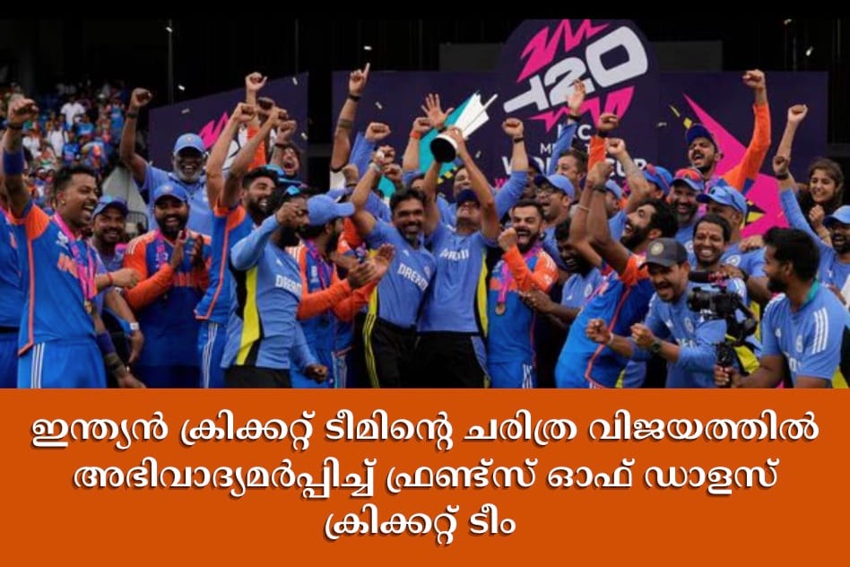 ഡാളസ് :ട്വന്റി20 ലോകകപ്പിൽ ഇന്ത്യ–ദക്ഷിണാഫ്രിക്ക പോരാട്ടത്തിൽ ചരിത്ര വിജയം നേടിയ ഇന്ത്യൻ ക്രിക്കറ്റ് ടീമിന് അഭിവാദ്യമർപ്പിച്ച് ഫ്രണ്ട്സ് ഓഫ് ഡാളസ് ക്രിക്കറ്റ് ടീം .ട്വൻറി 20 ലോകകപ്പിൽ 17 വർഷത്തിനു ശേഷമാണ് ഇന്ത്യ ക്രിക്കറ്റ് ടീം കിരീടം ചൂടിയത്.