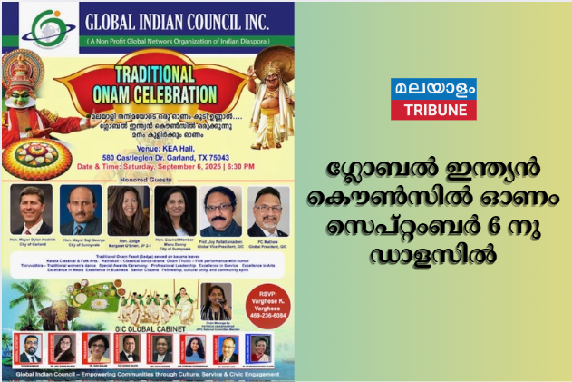 ഡാളസ്: ഇന്ത്യൻ സമൂഹത്തിന്റെ ഗ്ലോബൽ നെറ്റ്വർക്ക് സംഘടനയായ ഗ്ലോബൽ ഇന്ത്യൻ കൌൺസിൽ ഈ വരുന്ന ശനിയാഴ്ച സെപ്റ്റംബർ 6 ന് (വൈകിട്ട് 6:30 ന്)പരമ്പരാഗത രീതിയിൽ ഓണ സദ്യയും ഒപ്പം കലാ പരിപാടികളും നടത്തുന്നു.( Address: KEA Hall, 580 Castleglen Dr., Garland, Tx-75043).
