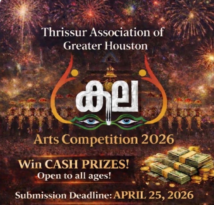 ഹൂസ്റ്റൺ: തൃശൂർ അസോസിയേഷൻ ഓഫ് ഗ്രേറ്റർ ഹൂസ്റ്റണിന്റെ ആഭിമുഖ്യത്തിൽ 'കല 2026' എന്ന പേരിൽ വിപുലമായ കലാമത്സരങ്ങൾ സംഘടിപ്പിക്കുന്നു. "തൃശൂർ - കേരളത്തിന്റെ സാംസ്കാരിക തലസ്ഥാനം" എന്ന പ്രമേയത്തെ ആസ്പദമാക്കിയാണ് മത്സരങ്ങൾ നടക്കുന്നത്. എല്ലാ പ്രായക്കാർക്കും പങ്കെടുക്കാവുന്ന ഈ മത്സരത്തിൽ ആകർഷകമായ പണക്കിഴികളാണ് വിജയികളെ കാത്തിരിക്കുന്നത്.