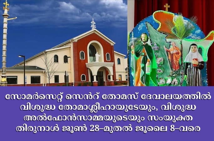 ന്യൂജേഴ്സി: സോമര്സെറ്റ് സെന്റ് തോമസ് സീറോ മലബാര് കാത്തലിക് ഫൊറോനാ ദേവാലത്തിൽ ഭാരതത്തിന്റെ അപ്പസ്തോലനും, നമ്മുടെ വിശ്വാസത്തിന്റെ പിതാവും, ഇടവക മധ്യസ്ഥനുമായ വിശുദ്ധ തോമാശ്ശീഹായുടേയും, ഭാരതത്തിലെ ആദ്യ വിശുദ്ധ, അല്ഫോന്സാമ്മയുടേയും തിരുനാള്, ജൂൺ 28 – മുതല് ജൂലൈ 7 – വരെ സംയുക്തമായി കൊണ്ടാടുന്നതായി ഇടവക വികാരി ഫാ. ആൻ്റണി പുല്ലുകാട്ട് സേവ്യർ അറിയിച്ചു.