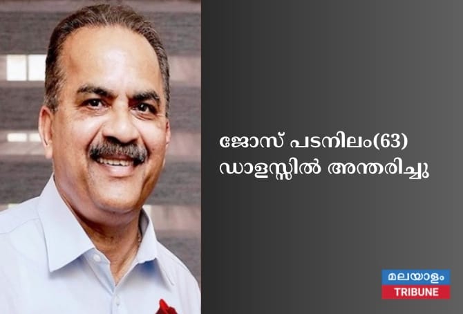 സണ്ണിവെയ്ൽ(ഡാളസ്) ജോസ് പടനിലം(63) ഡാളസ്സിൽ അന്തരിച്ചു.കോട്ടയം മറിയപ്പിള്ളി പഠനിലത്തു തോപ്പിൽ ഇട്ടിവര്ഗീസിന്റെയും സുസമ്മയുടെയും മകനാണ്