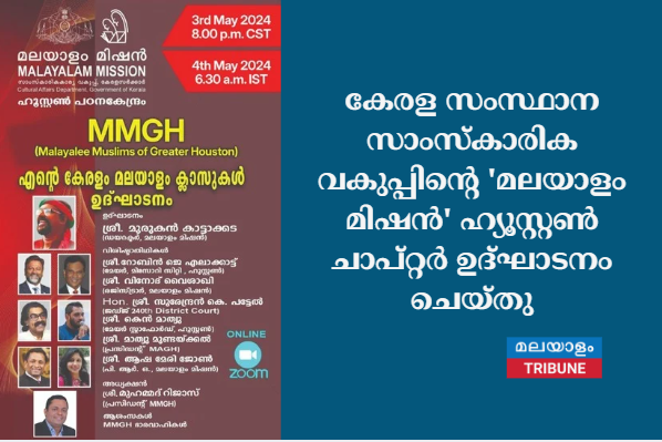 ഹ്യൂസ്റ്റണ് (ടെക്സാസ്): കേരള സർക്കാരിന്റെ സാംസ്കാരിക വകുപ്പിന് കീഴിലുള്ള മലയാളം മിഷനും, മലയാളി മുസ്ലിംസ് ഓഫ് ഗ്രേയ്റ്റര് ഹ്യൂസ്റ്റണും (MMGH) സംയുക്തമായി "എന്റെ കേരളം" ഓൺലൈൻ മലയാളം ക്ലാസുകൾ വിജയകരമായി ആരംഭിച്ചു. ഈ പരിപാടിയോടൊപ്പം, കേരള സംസ്ഥാന മലയാളം മിഷന്റെ ഹ്യൂസ്റ്റണ് ചാപ്റ്ററിന്റെ ഉദ്ഘാടനവും നടന്നു. ഹ്യൂസ്റ്റണിലെ മലയാളി കുട്ടികൾക്ക് മലയാള ഭാഷയിൽ സമഗ്രമായ അടിത്തറ നൽകുകയും അവരുടെ സാംസ്കാരിക വേരുകളോടുള്ള ആഭിമുഖ്യം വളർത്തിയെടുക്കുകയും ചെയ്യുക എന്ന ലക്ഷ്യത്തോടെയാണ് ഈ പാഠ്യ പദ്ധതി ആരംഭിച്ചിരിക്കുന്നത്.