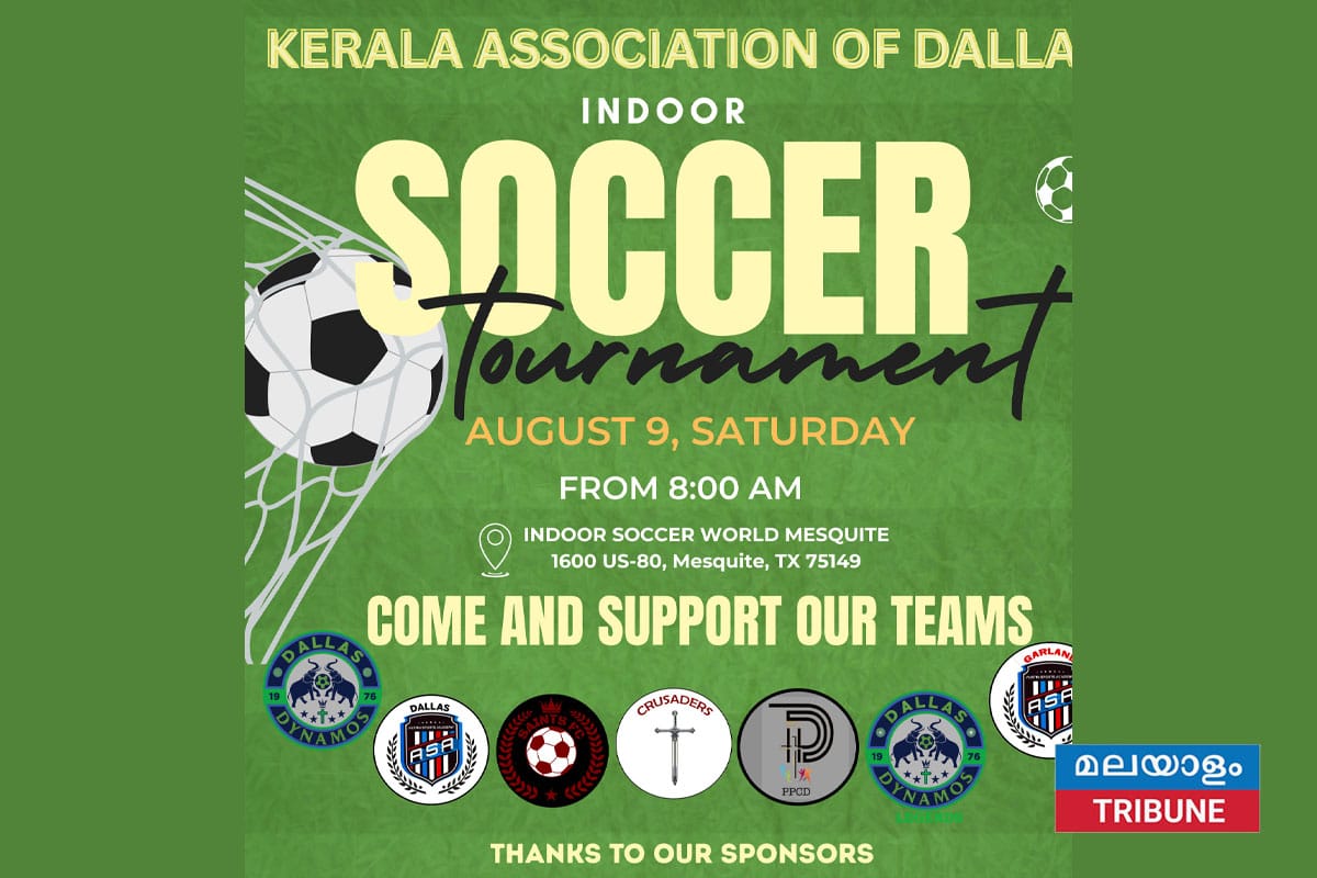 മെസ്ക്വിറ്റ്: കേരള അസോസിയേഷൻ ഓഫ് ഡാളസ് സംഘടിപ്പിക്കുന്ന ഇൻഡോർ സോക്കർ ടൂർണമെന്റ് ആവേശകരമായ മത്സരങ്ങളോടെ ഓഗസ്റ്റ് 9-ന് ആരംഭിക്കും .മെസ്ക്വിറ്റിലെ ഇൻഡോർ സോക്കർ വേൾഡിൽ വെചു നടക്കുന്ന ഈ കായിക മാമാങ്കം. രാവിലെ 8 മണിക്ക് ആരംഭിച്ച് വൈകുന്നേരം 7 മണി വരെ നീണ്ടുനിൽക്കും.ടൂർണമെന്റിൽ ആകെ ഏഴ് ടീമുകളാണ് പങ്കെടുകുന്നത്