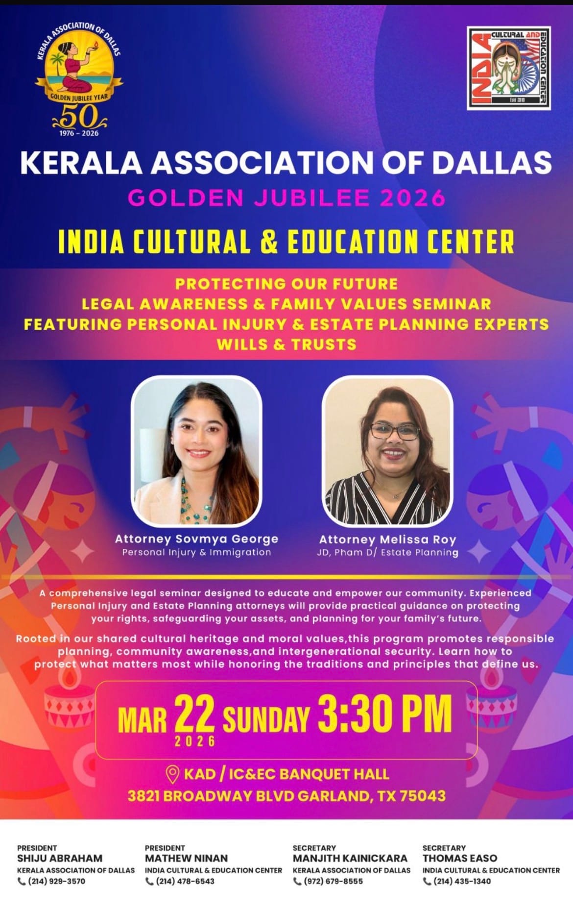 2026 മാർച്ച് 22, ഞായറാഴ്ച വൈകുന്നേരം 3:30 KAD / IC&EC ബാങ്ക്വറ്റ് ഹാളിലാണ് (3821 Broadway Blvd, Garland, TX 75043) സെമിനാര്