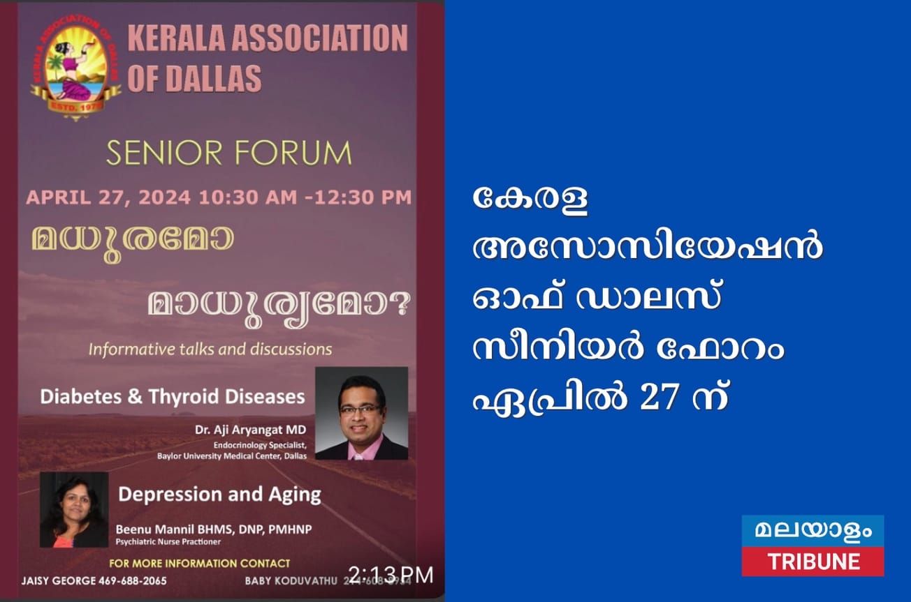 ഗാർലൻഡ് (ഡാളസ് ): കേരള അസോസിയേഷൻ ഓഫ് ഡാലസിന്റെ ആഭിമുഖ്യത്തിൽ സീനിയർ ഫോറം "മധുരമോ മാധുര്യമോ"സംഘടിപ്പിക്കുന്നു ഏപ്രിൽ 27 ശനിയാഴ്ച രാവിലെ 10 30 മുതലാണ് പരിപാടികൾ ആരംഭിക്കുന്നത് .പ്രസിഡന്റ് പ്രദീപ് നാഗനൂലിന്റെ അധ്യക്ഷതയിൽ ചേരുന്ന ചേരുന്ന യോഗത്തിൽ തൈറോയ്ഡ് ഡിസീസ്എന്ന വിഷയത്തെ അധികരിച്ച് ഡോ:അജി ആര്യൻകാട്ടും, ഡിപ്രഷൻ ആൻഡ് ഏജിഗിനെ കുറിച്ച് ബീന മണ്ണിൽ (സൈക്യാട്രിക് നഴ്സ് പ്രാക്റ്റീഷനർ) പ്രഭാഷണം നടത്തും