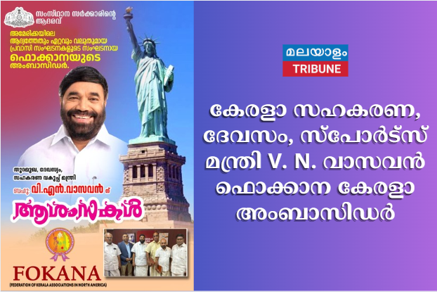 ന്യൂ യോർക്ക് : ഫൊക്കാനയുടെ (ഫെഡറേഷൻ ഓഫ് കേരളാ അസ്സോസിയേഷൻസ് ഇൻ നോർത്ത് അമേരിക്ക ) കേരളാ അംബാസിഡർ ആയി കേരളാ സഹകരണ , ദേവസം , സ്പോർട്സ് മന്ത്രി V. N. വാസവൻ , ബഹുമാനാപ്പെട്ട മന്ത്രിയുമായി നേരിട്ട് നടത്തിയ ചർച്ചയുടെ ഭലമായി അദ്ദേഹം ആ സ്ഥാനം സന്തോഷപൂർവ്വം സ്വീകരിക്കുകയായിരുന്നു. ആദ്യമായാണ് ഒരു കേരള മന്ത്രി ഫൊക്കാനയുടെ അംബാസിഡർ ആകുന്നത്.